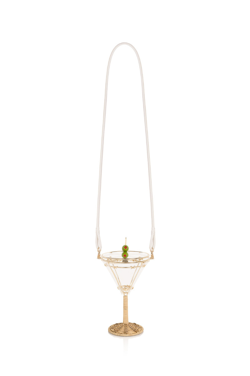 Drink cup-shaped bag with metal frame and braided wicker. Comes with leather shoulder strap.