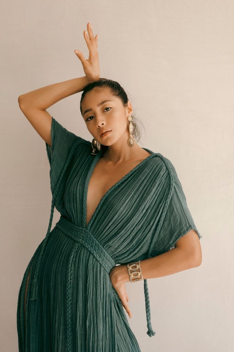 A slinky open concept update to our signature Athena Maxi Dress - deep V cut, classic braided waist, and details along the sleeves. Use the shoulder braids to tie and wrap up the Grecian-style sleeves to let the sunshine kiss your skin. The high side slits come together at the braided waistline from which the pleated open skirt panels flow. This beach cover-up transforms to night in a breeze!