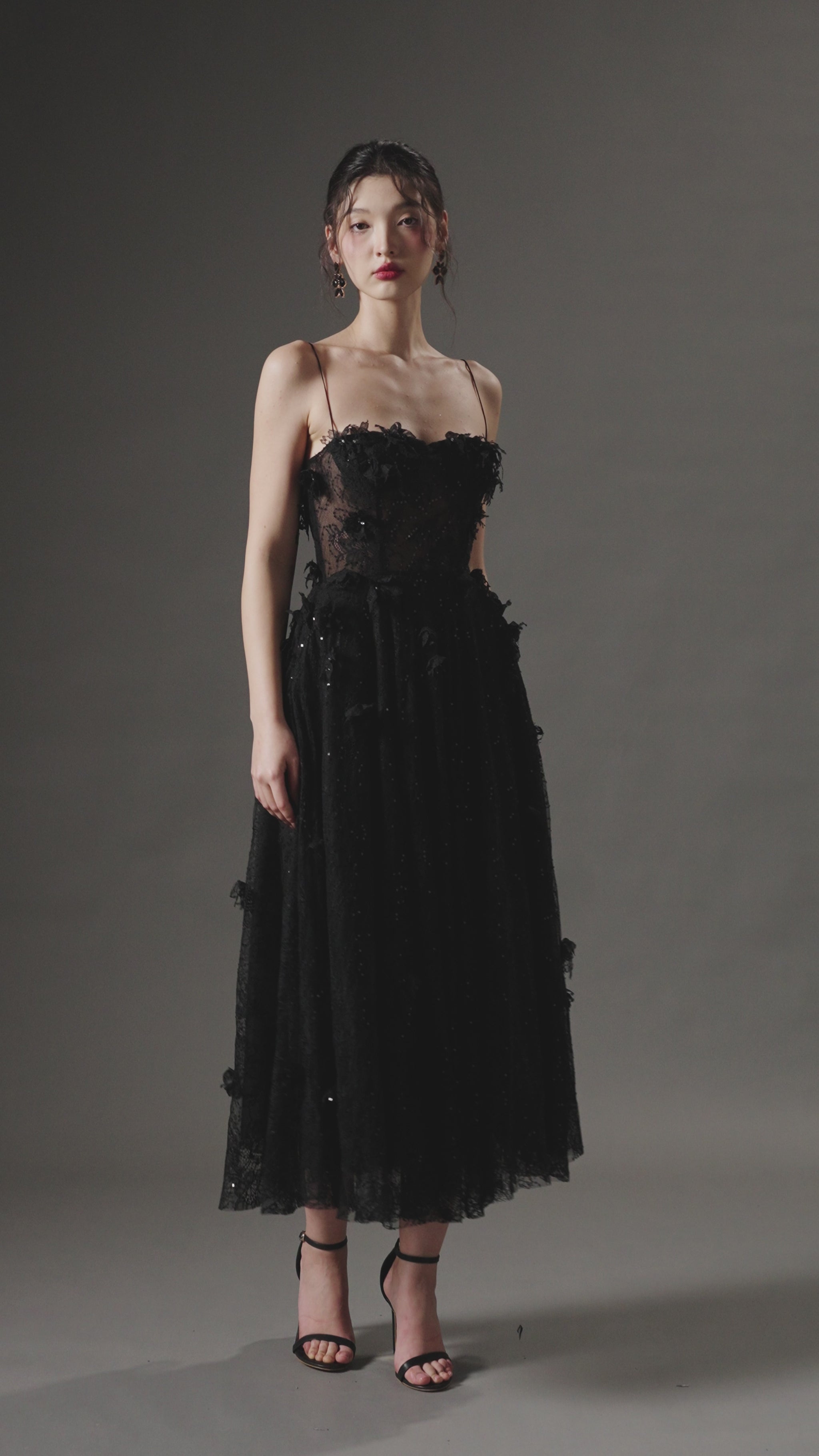 - Hand-applied floral embellishments for a poetic, luxe finish