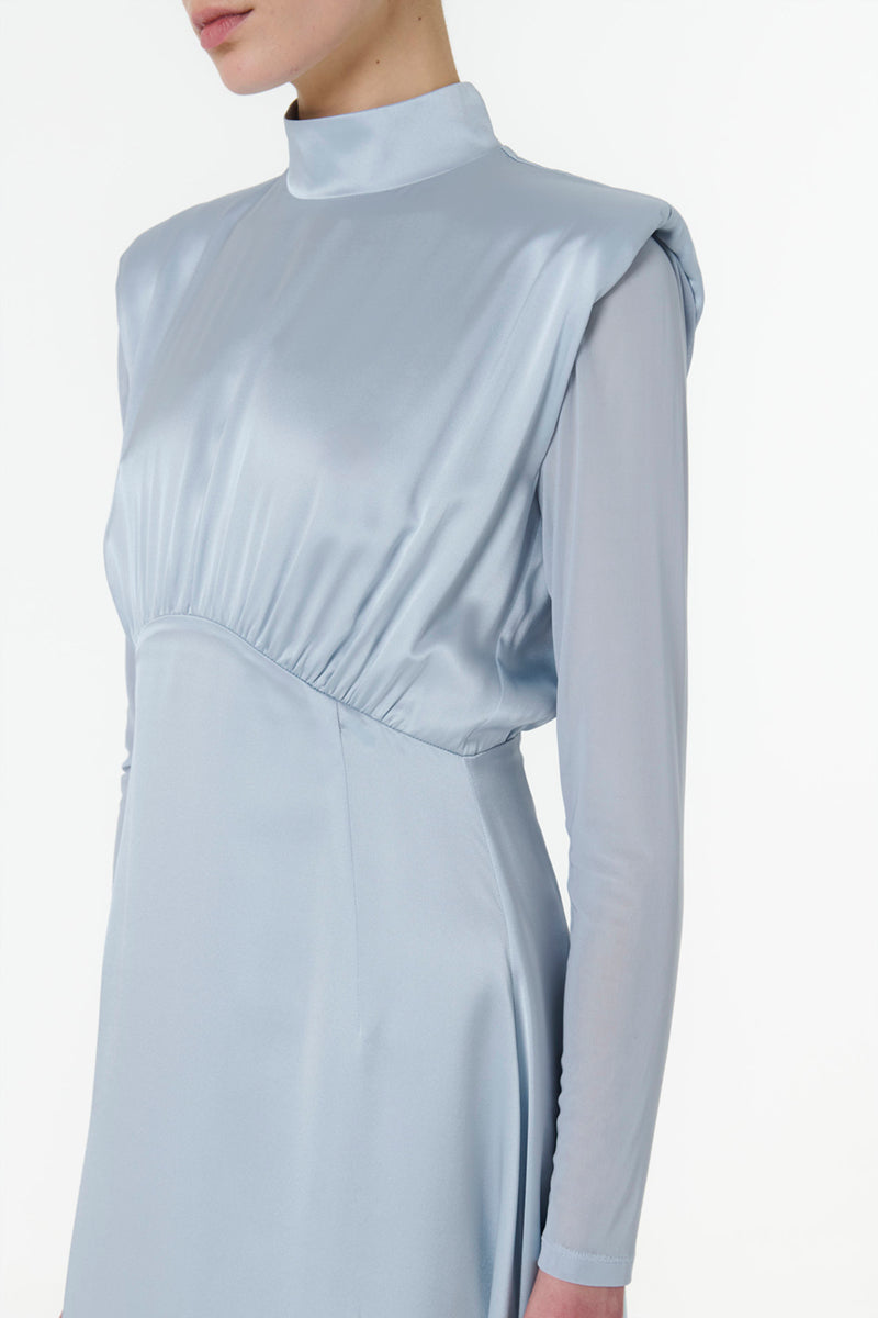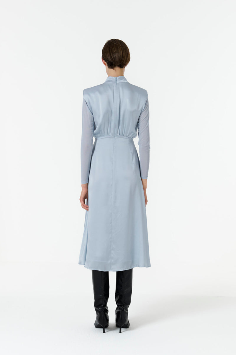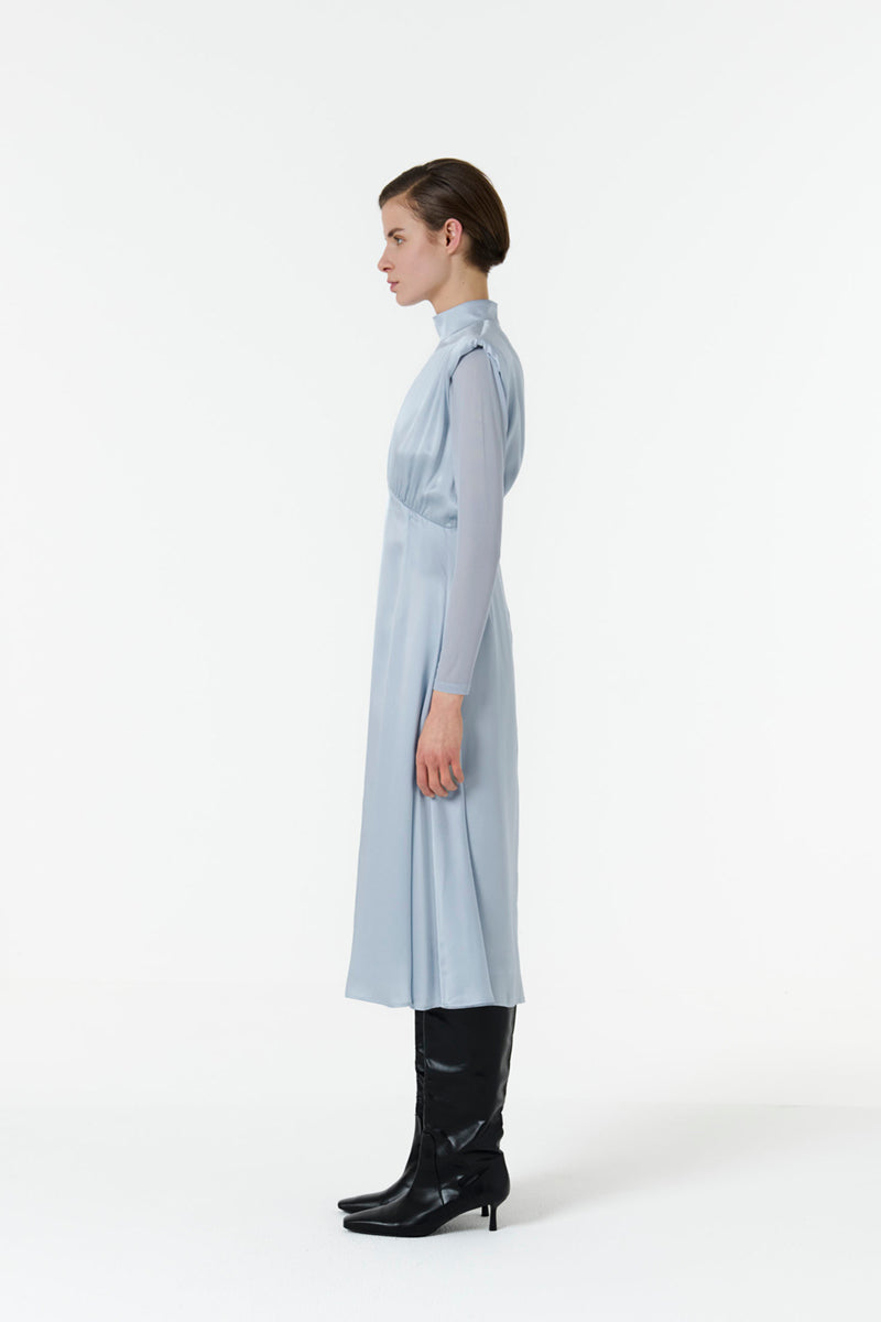 This High-Neck Silk Dress is all about quiet statement. The sheer mesh sleeves and high neckline create contrast and poise, while the gathered waist adds shape with intention. Every detail feels thoughtfully placed—soft, fluid, and flattering. Just the piece for evenings that call for subtle refinement.