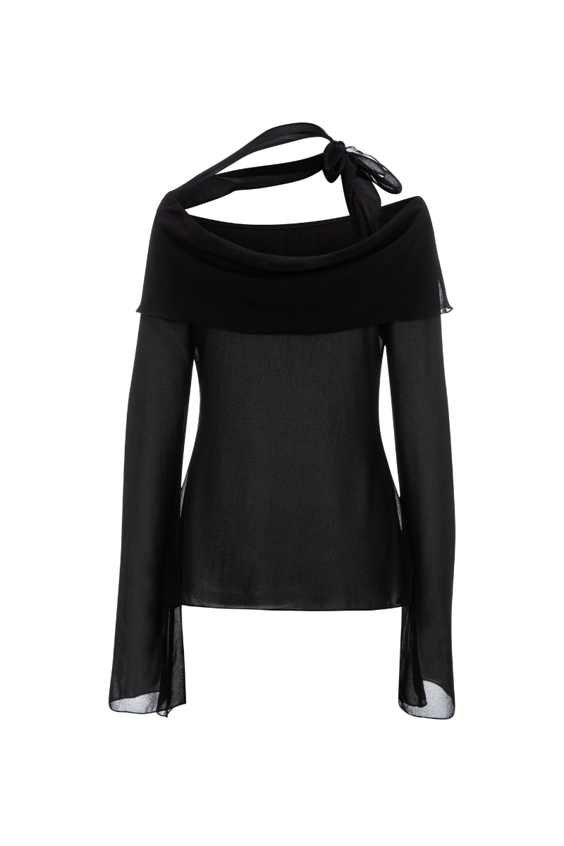 The Laura Top is made from sheer material, featuring long sleeves, a front tie closure, and a double neck that ties up at the back. For a coordinated look, pair it with the Laura Skirt.