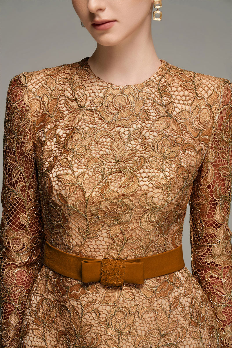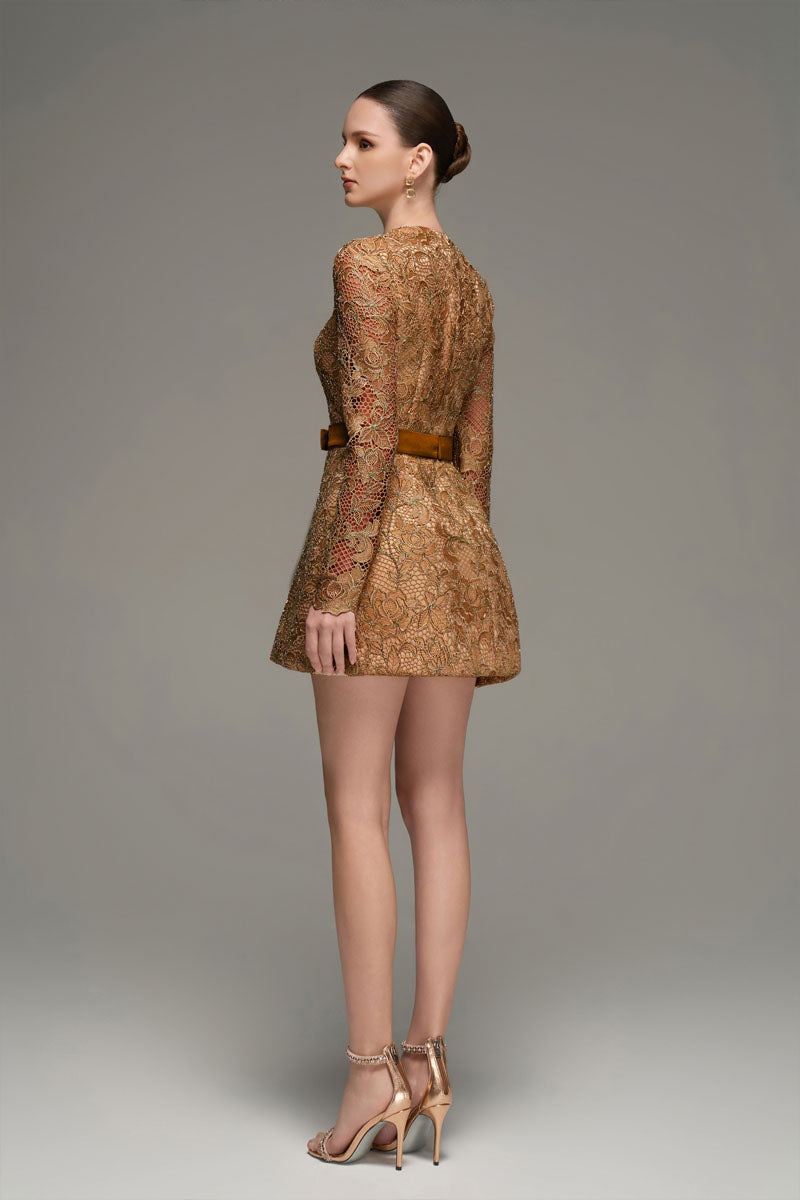 This exquisite mini dress exudes timeless elegance with its delicate lace detailing and fitted long sleeves. The intricate patterns shimmer subtly, while a cinched waist with a minimalist bow accentuates the silhouette. Perfectly blending romance and sophistication, this piece is a statement of refined luxury.