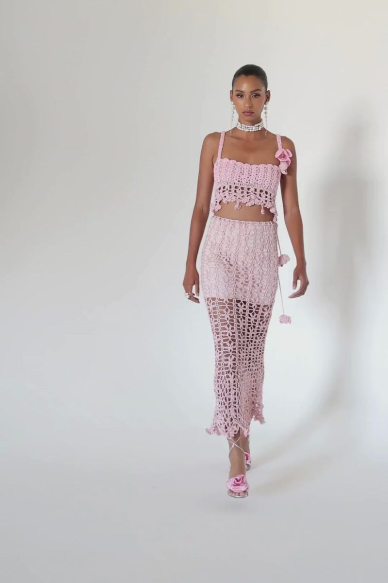 Pink Vanilla handmade crochet skirt is a loose open-knit with lining, a fitted silhouette creates perfect fit. Perfect combination with Pink Vanilla crochet top and pair of mules.