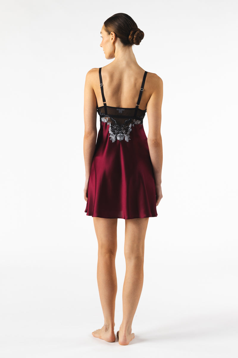 Channel your inner femme fatale in the luxurious Roxy Bust Support Chemise. Elegant Bordeaux silk with Black-Silver two-tone touches create a red silk chemise that is both luxurious and borderline dangerous. It’s time to captivate hearts with rapturous Roxy. Wear it alone or with the Roxy Short Silk Robe and be anything but ordinary.