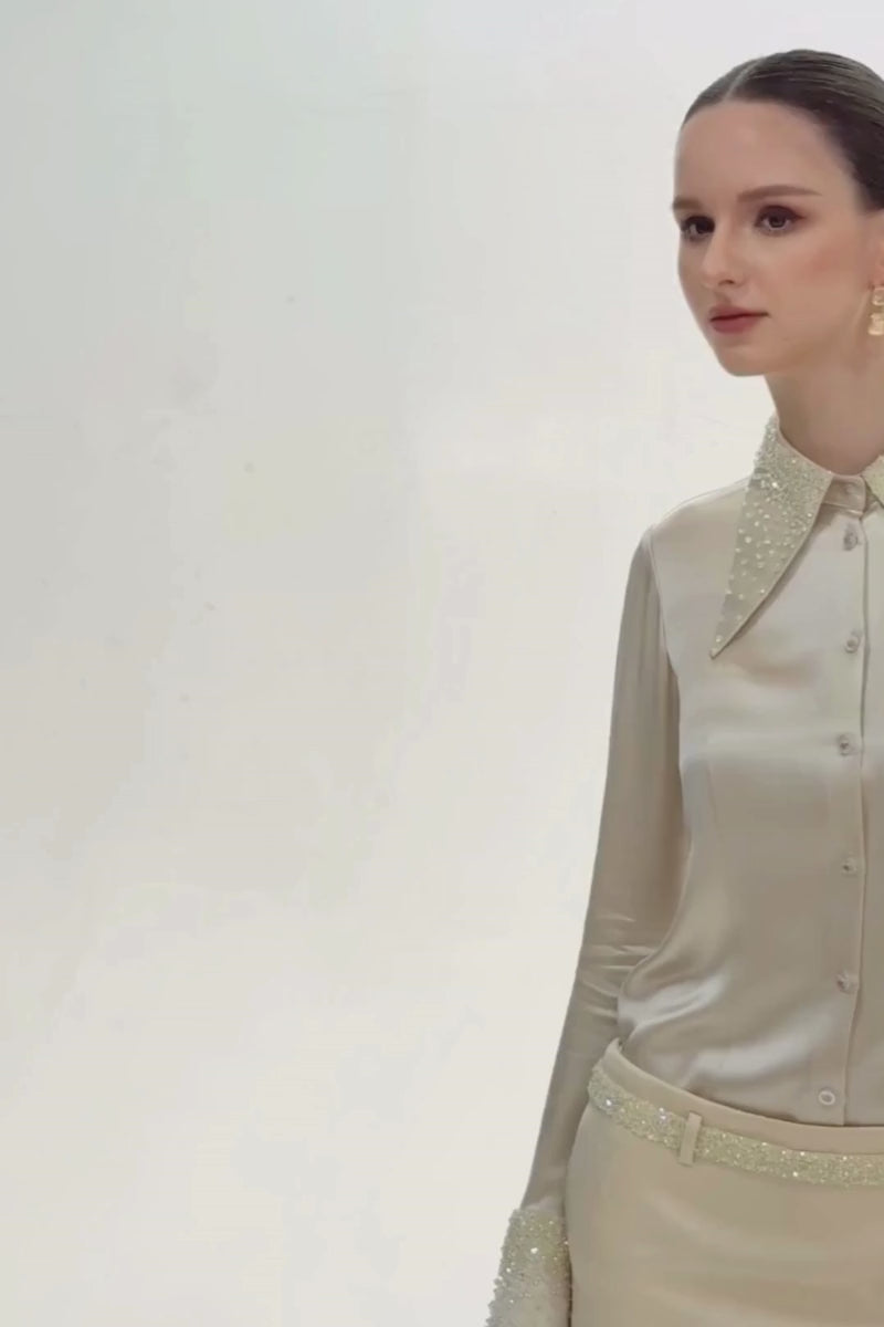 This elegant ensemble exudes modern sophistication with its sleek satin shirt, tailored to perfection with a structured collar and crystal-embellished cuffs for a touch of opulence. Paired with a low-rise mini skirt adorned with delicate crystal accents on the waistband, the look strikes a balance between classic refinement and contemporary allure. The luxurious sheen of the fabric enhances its timeless appeal, making it a chic choice for any high-fashion occasion.