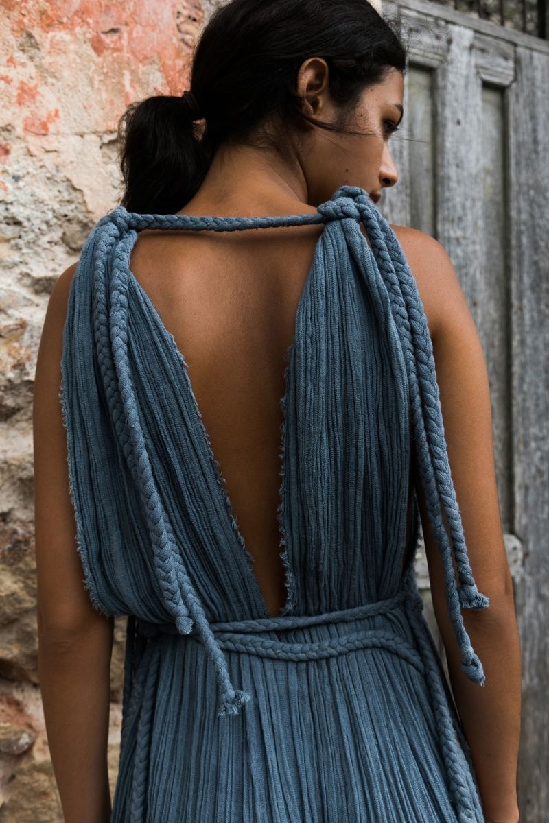 Strong, harnessed, braided shoulders with a deep V neckline represent the dichotomy of feminine in this unique open concept gown. The high open seams crossover at the structured waistline crafted of three prominent handwoven braids from which the breezy open skirt flows. Meticulous gathered pleating, synonymous with the Kasia Kulenty label, gives life to a dynamic textured effect where comfort and luxury intersect.