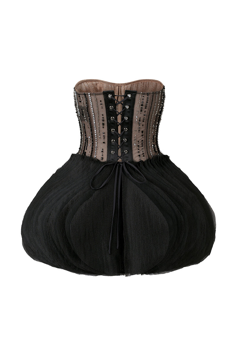 A captivating sleeveless cocktail dress adorned with delicate vertical beadwork that elongates the silhouette, complemented by cascading layers of petals at the hem. This exquisite design merges refined elegance with a touch of playful romance, making it a standout piece for any special occasion.