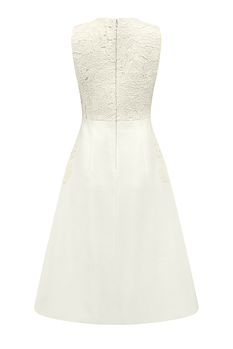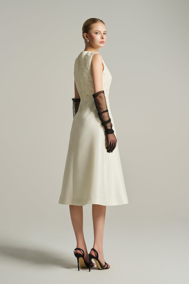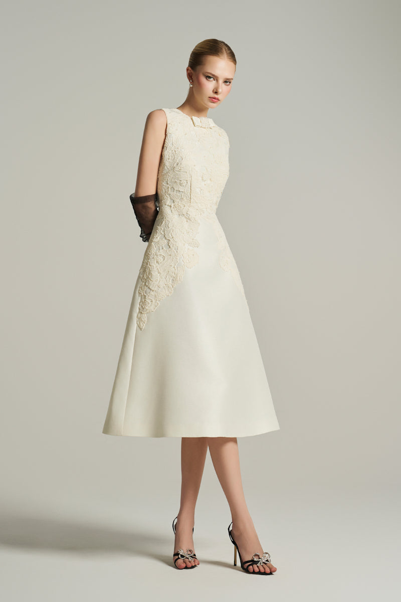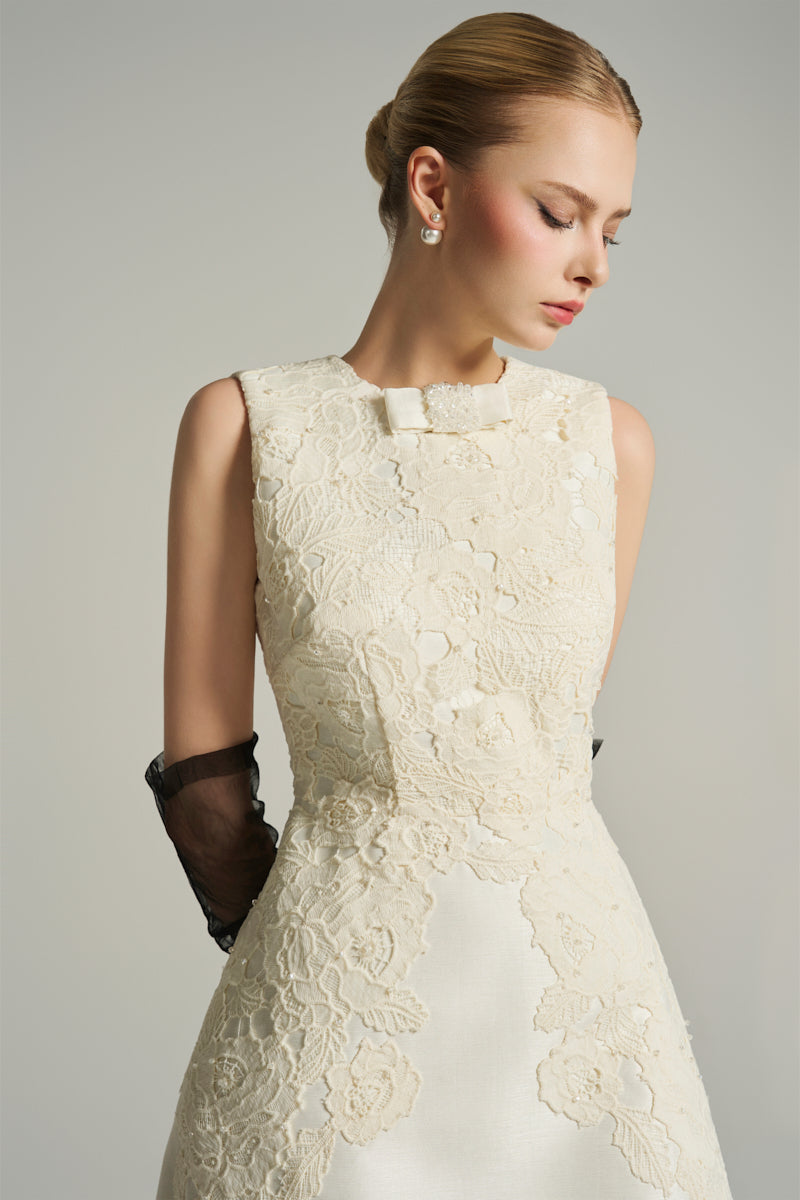 A refined midi dress crafted from luxurious taffeta, featuring intricate lace overlays that elegantly flow from the bodice. The design is accented by a delicate crystal-embellished bow at the neckline, adding a subtle touch of sparkle to the timeless silhouette. Perfect for sophisticated events, this dress combines classic lace detailing with modern embellishments