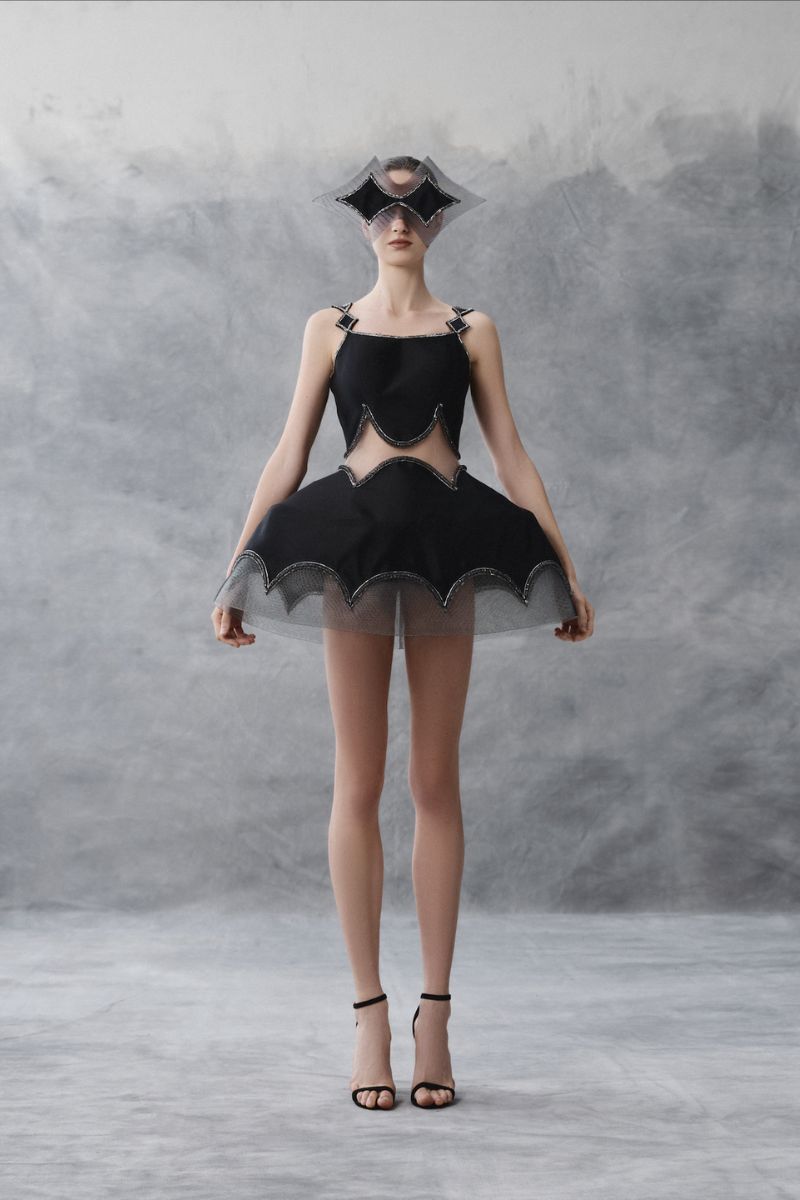 A striking straight-neck cocktail dress featuring a structured A-line hoop silhouette, accentuated by bold cut-out details at the waist and hem. This avant-garde design blends architectural precision with modern sensuality, making it a statement piece for contemporary couture lovers.