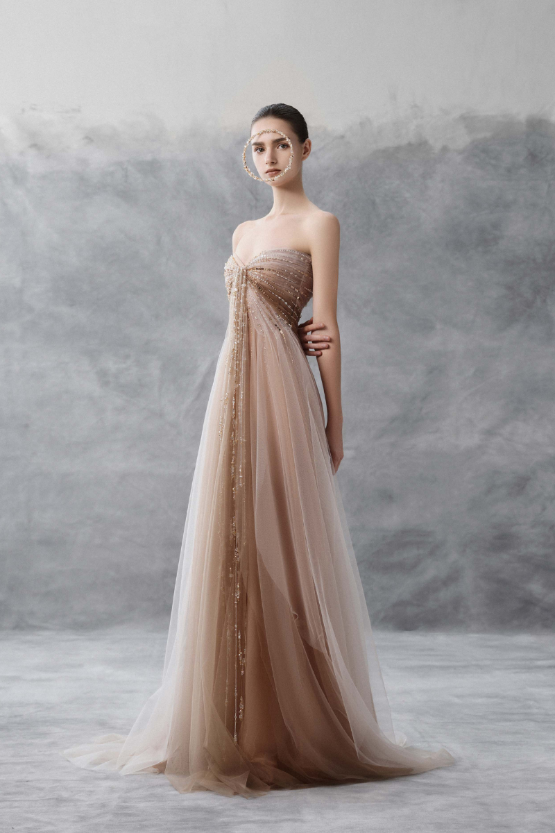 A graceful tulle empire waist dress, delicately draped to create a flowing, ethereal silhouette. Intricate embellishments adorn the bust, middle, and ribs, adding depth and artistry to the design. A timeless couture creation that embodies elegance and refined craftsmanship.