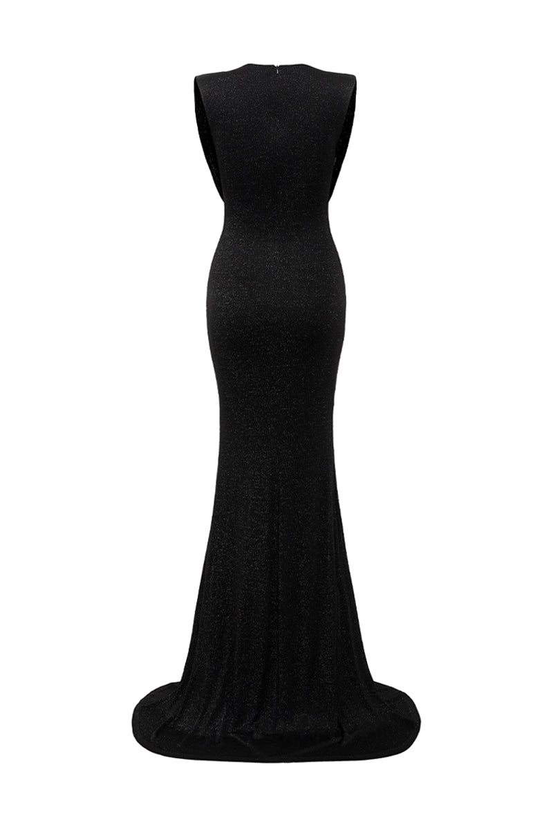 Floor-length jersey gown featuring a draped cowl-neckline, adding depth and elegance to the sleek silhouette. The soft jersey fabric skims the body, while delicate embellishments across the bust hidden behind the neckline provide a touch of sparkle. Perfect for evening wear, this dress combines modern sophistication with timeless glamour.