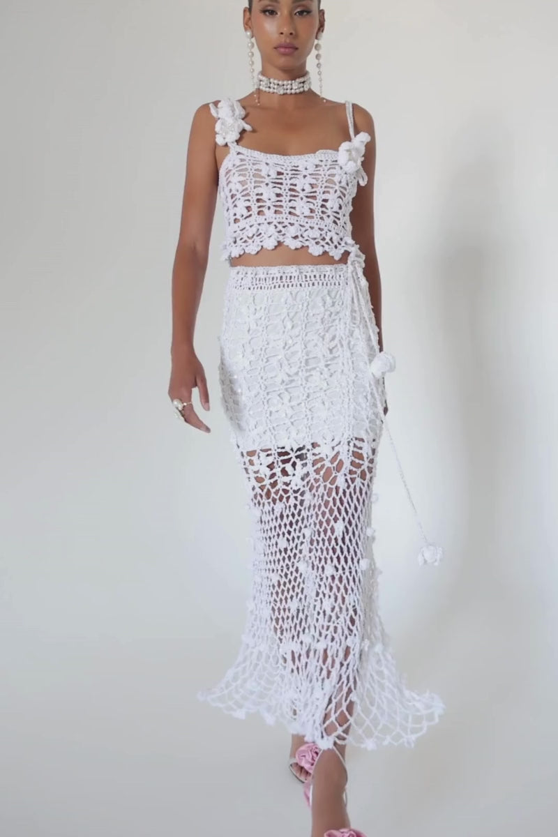 White Vanilla handmade crochet skirt is a loose open-knit with lining, a fitted silhouette creates perfect fit. Perfect combination with White Vanilla crochet top and pair of mules.
