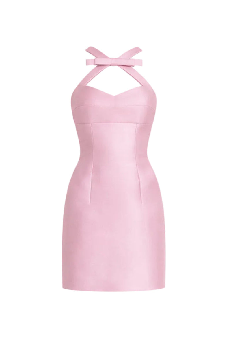 - Mikado satin, halterneck with crossover straps and bow detail