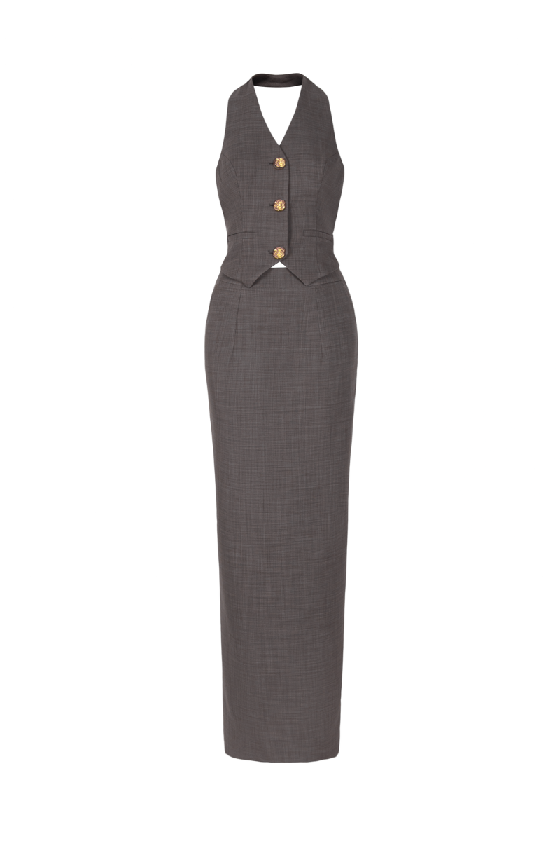 Luxuriously adorned with metal buttons, this backless halter top and attached pencil long skirt make up the perfect waistcoat set for any elegant occasion.