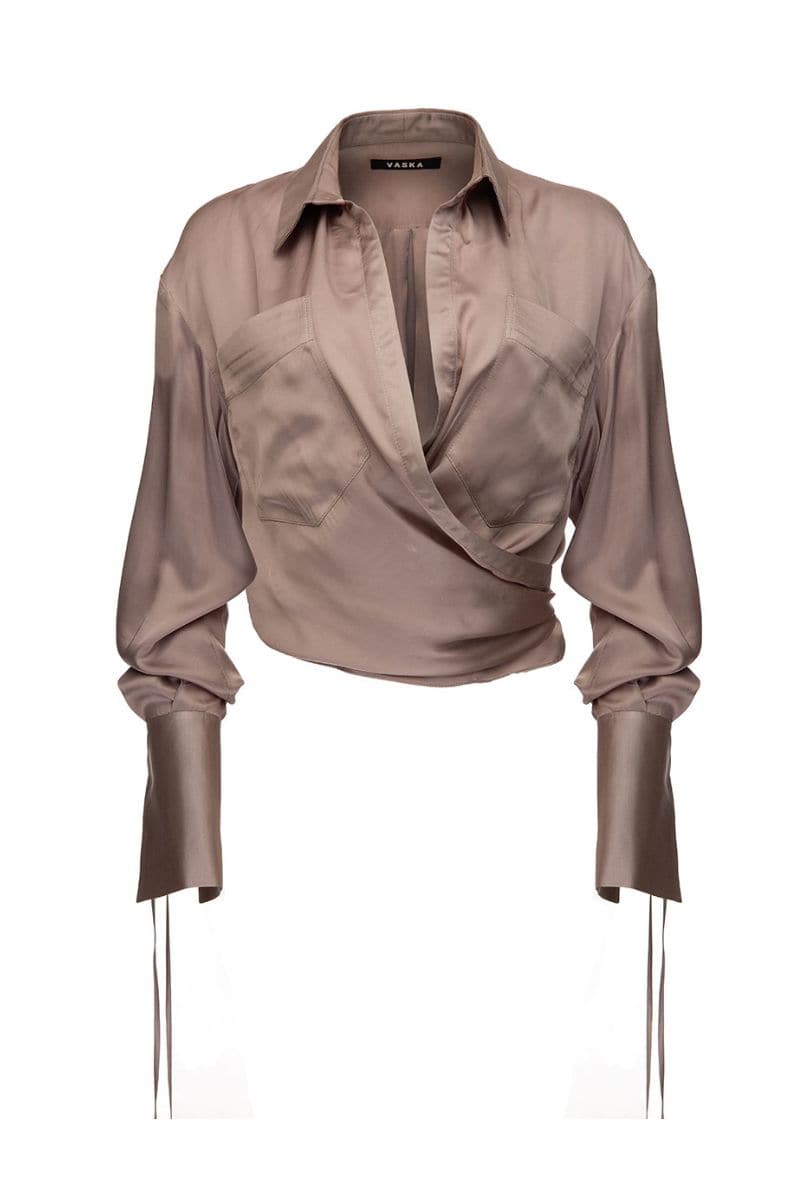 A sophisticated crop top with a shirt-style design, featuring a belt on the back and pockets on the bust. Handcrafted in Tbilisi, Georgia for a touch of luxury.