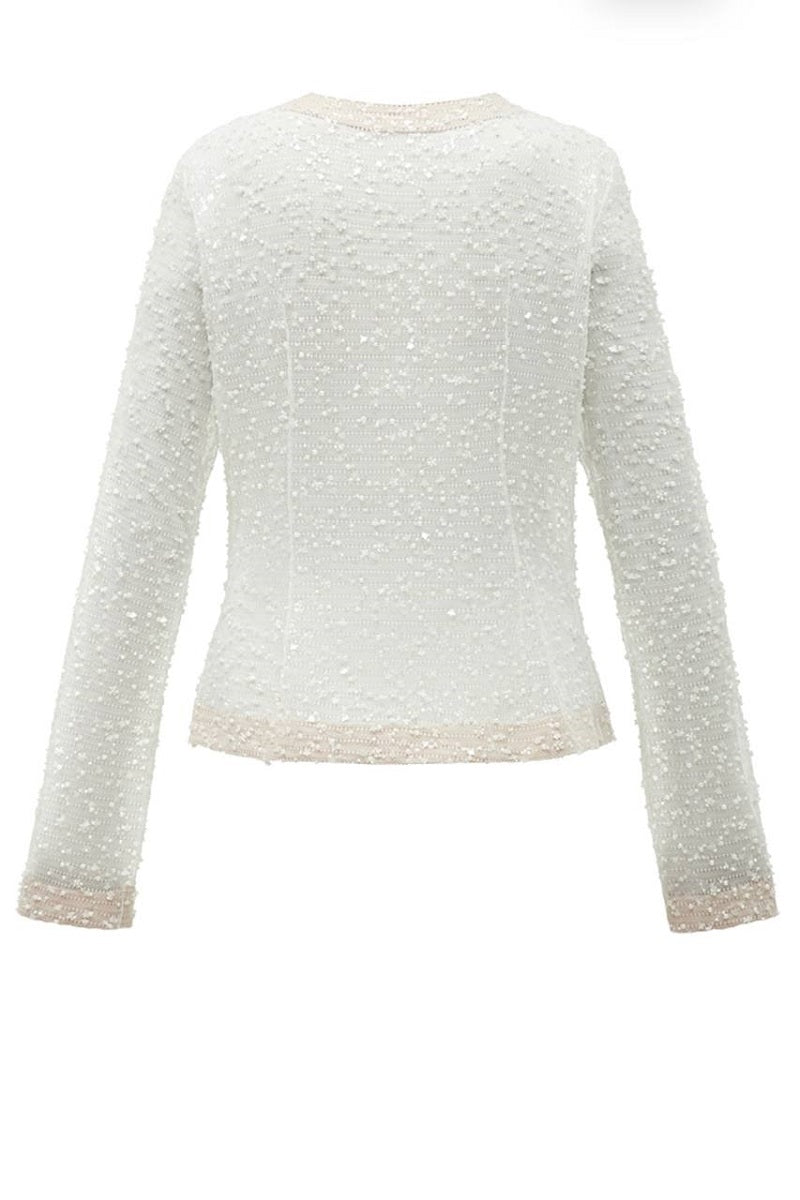 The transparent cardigan, made of fabric embroidered with beads, glass beads and sequins, impresses with its exquisite shine and lightness. The clasp is decorated with the brand's characteristic combination of various buttons, which has become its recognizable DNA. The original design of this cardigan adds uniqueness and elegance to the image, making it an ideal choice for festive events.