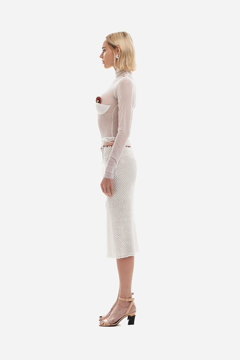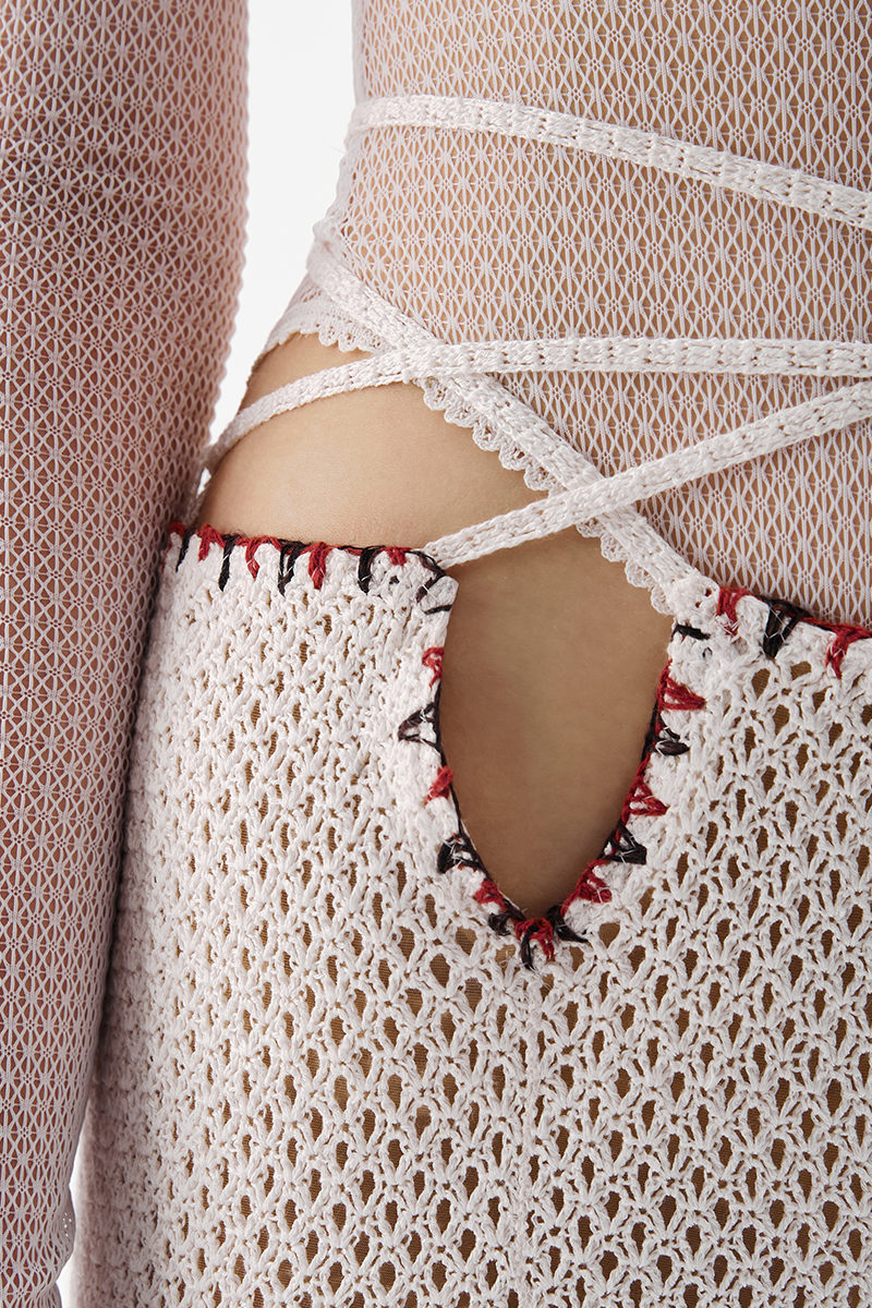 A skirt crocheted by hand from Italian luxury yarn and decorated with hand embroidery. The ties emphasize the waist, and the low fit on the hips emphasizes the femininity of the figure. Combine the skirt with cropped tops, T-shirts, a jacket or with a lace jumpsuit from our collection.