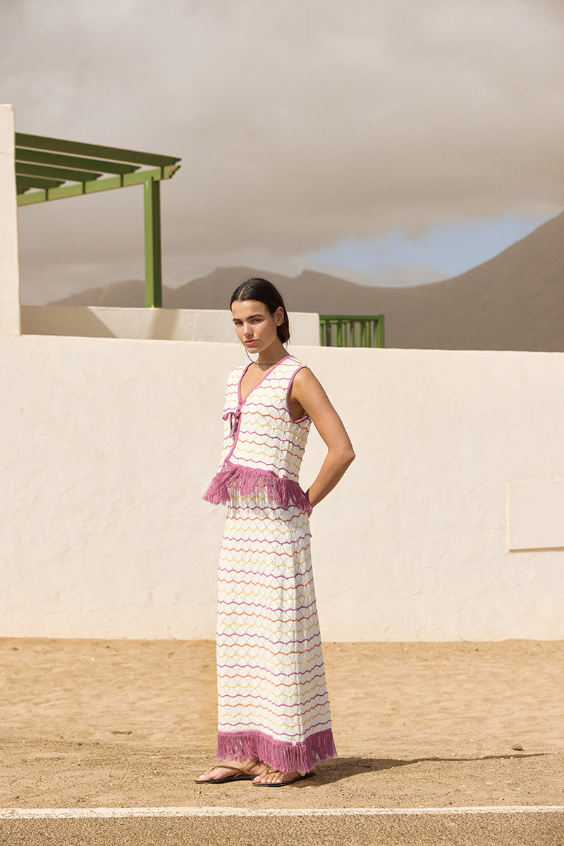 - Two- piece set: sleeveless tie- front top and high- rise skirt