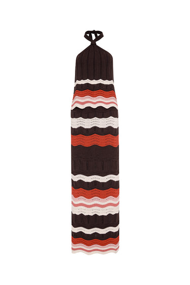 - Textured crochet- knit pattern with wavy stripes in brown, ivory, and coral tones