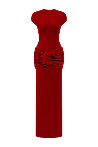 A bodycon dress featuring an underbust cut, structured extended shoulders, and ruched detailing at the hips that accentuates the waistline. Crafted from lustrous bright red velvet, it radiates sophistication, sensuality, and timeless allure.