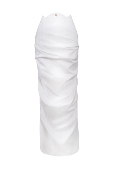 High-waisted structured skirt with sculptural draping embellished with a handcrafted artisanal button