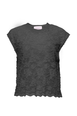The Sarah Top is a sleeveless beauty featuring butterfly-patterned lace, a crew neck, and an embroidered lace hem. Its versatile design allows for layering over other tops or dresses, adding a feminine touch to any ensemble.