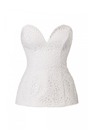 A unique corset top made of embroidered white lace. It hugs the bust and waist and is supported with underwires. Down from the waist, it forms an extension in the form of a bell. It is fastened with a zip at the back. Wear it with Ally Off White Embroidered Lace Pants or any of our Off White Pants to create a perfect set for a wedding, cocktail party or any summer occasion when you want to stand out.