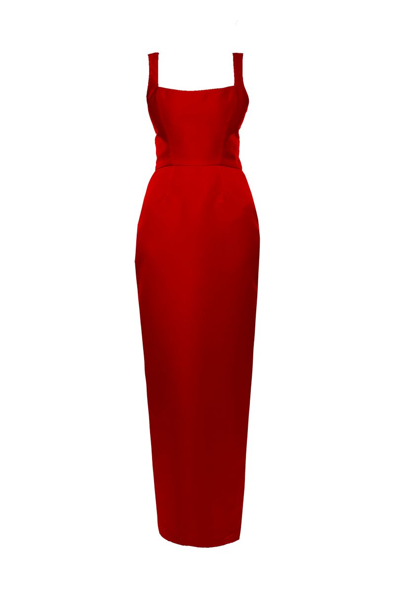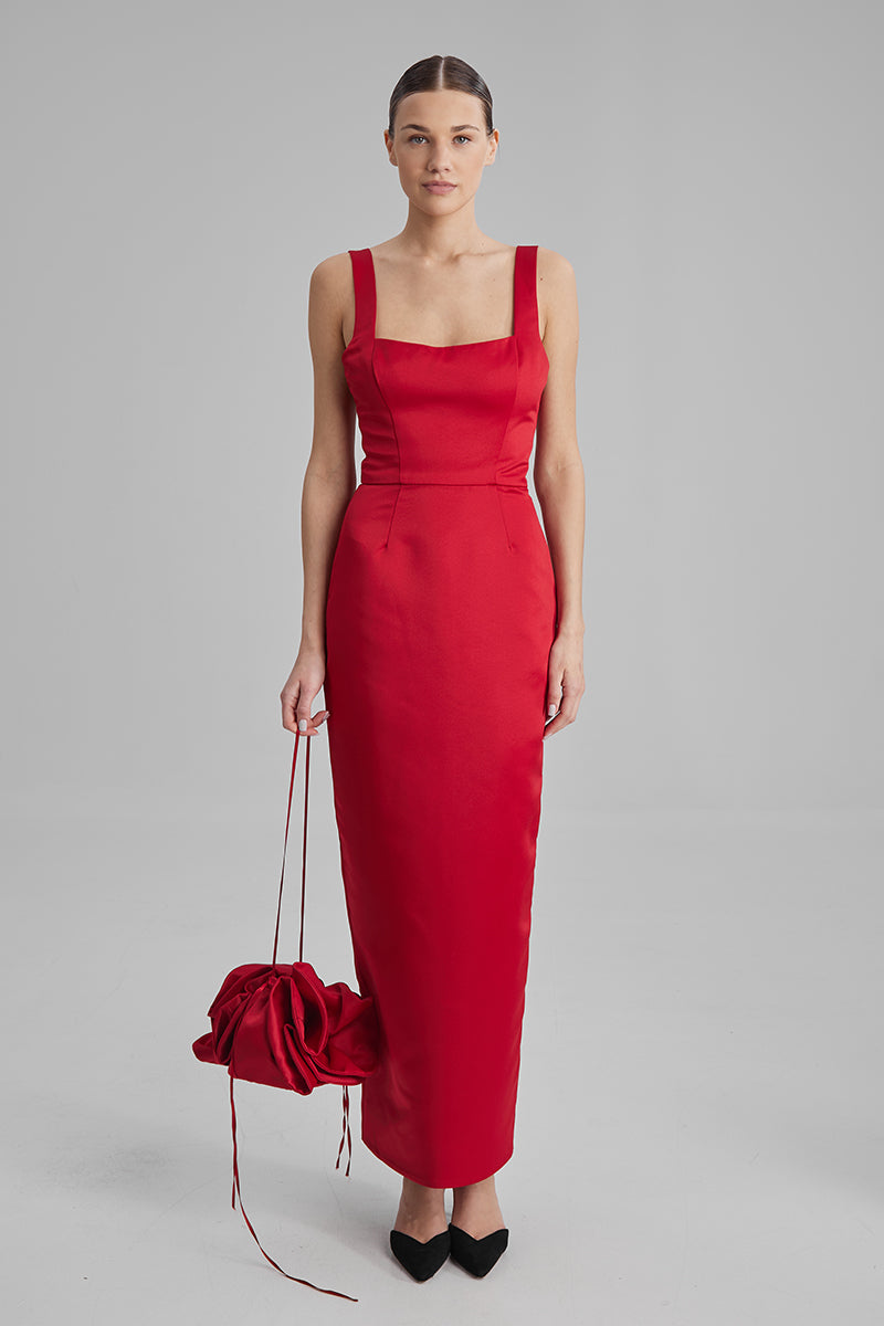 Elevate your style with a luxurious square-cut dress featuring adjustable straps, a fitted skirt, and full lining.