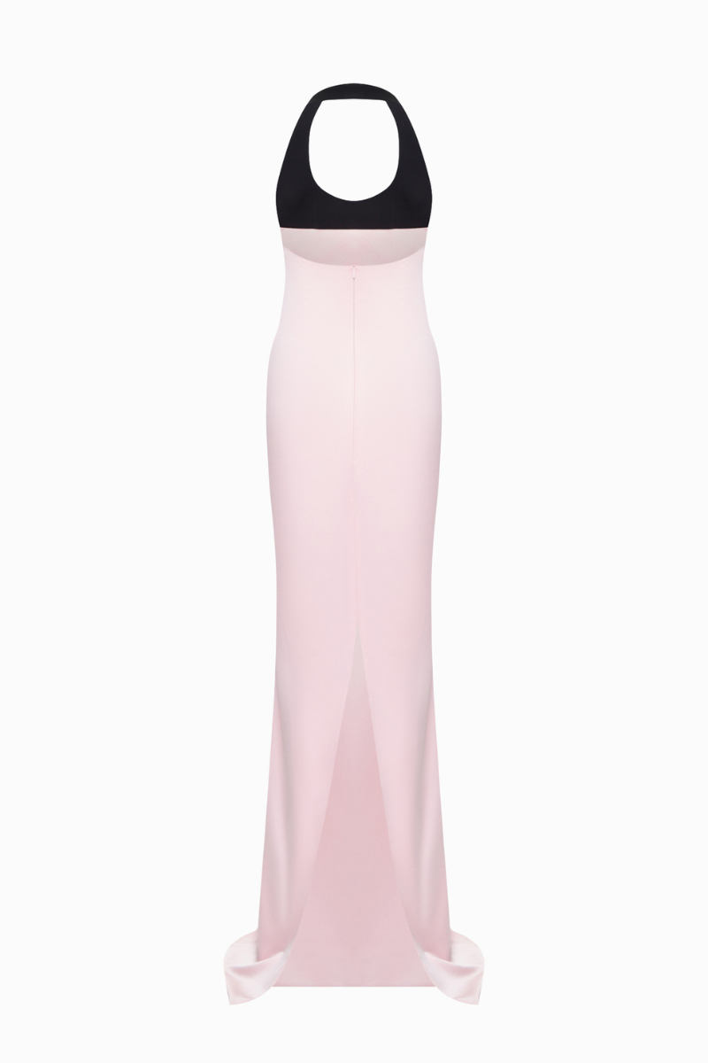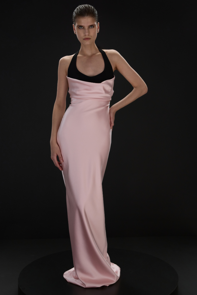A flowing silk maxi dress with a halterneck design. The airy fabric and soft pink tone create an elegant, elongated silhouette.
