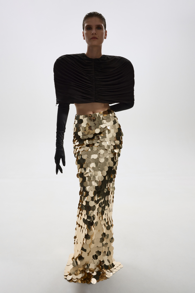 A minimalist stretch cape with a fluid drape and soft structure. Designed to complement evening looks, adding movement and understated drama.