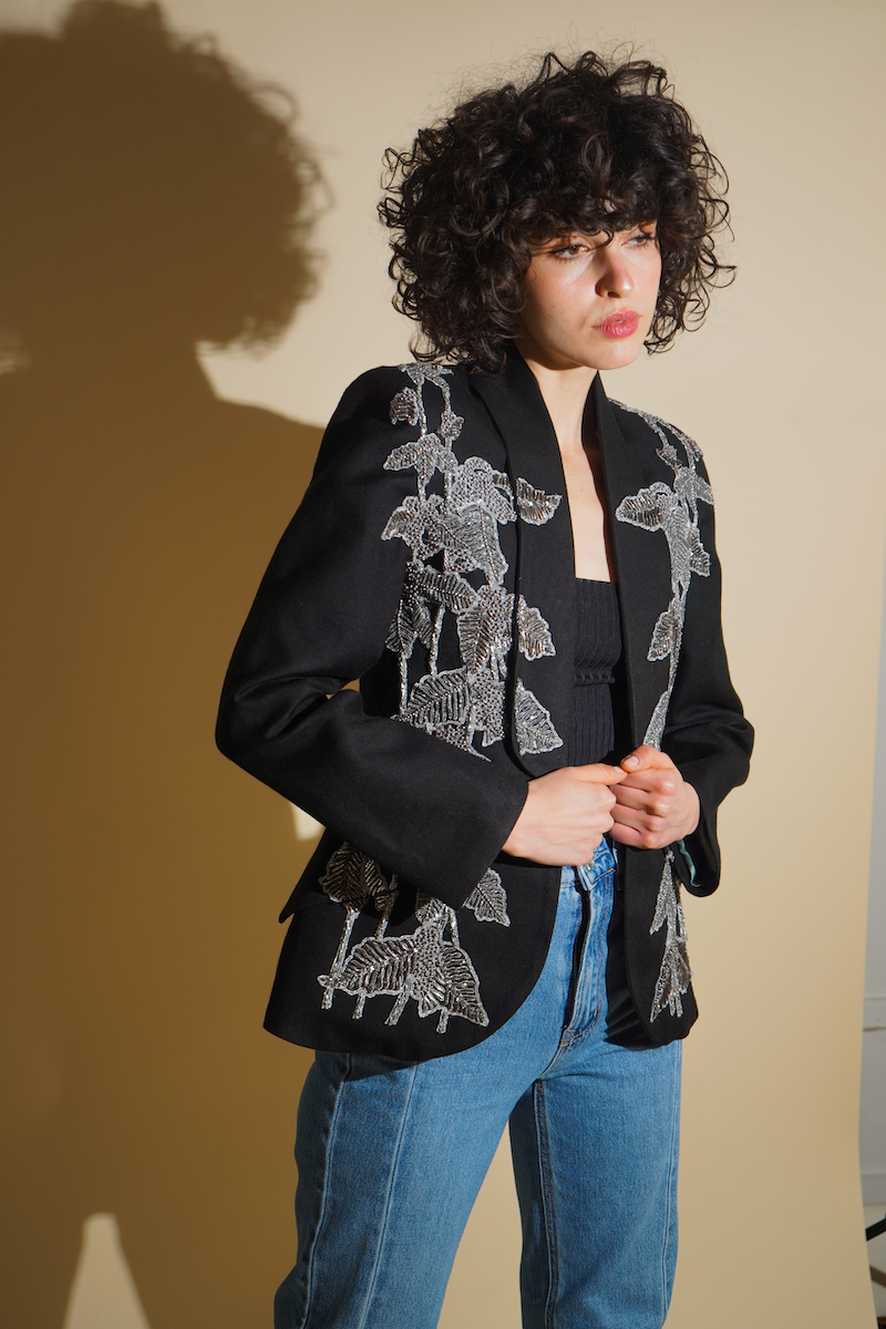 Introducing the AGNES BLACK BEADED JACKET- A sophisticated blazer with a structured design and luxurious touches such as side pocket detailing, wool-covered buttons, and a shawl collar.