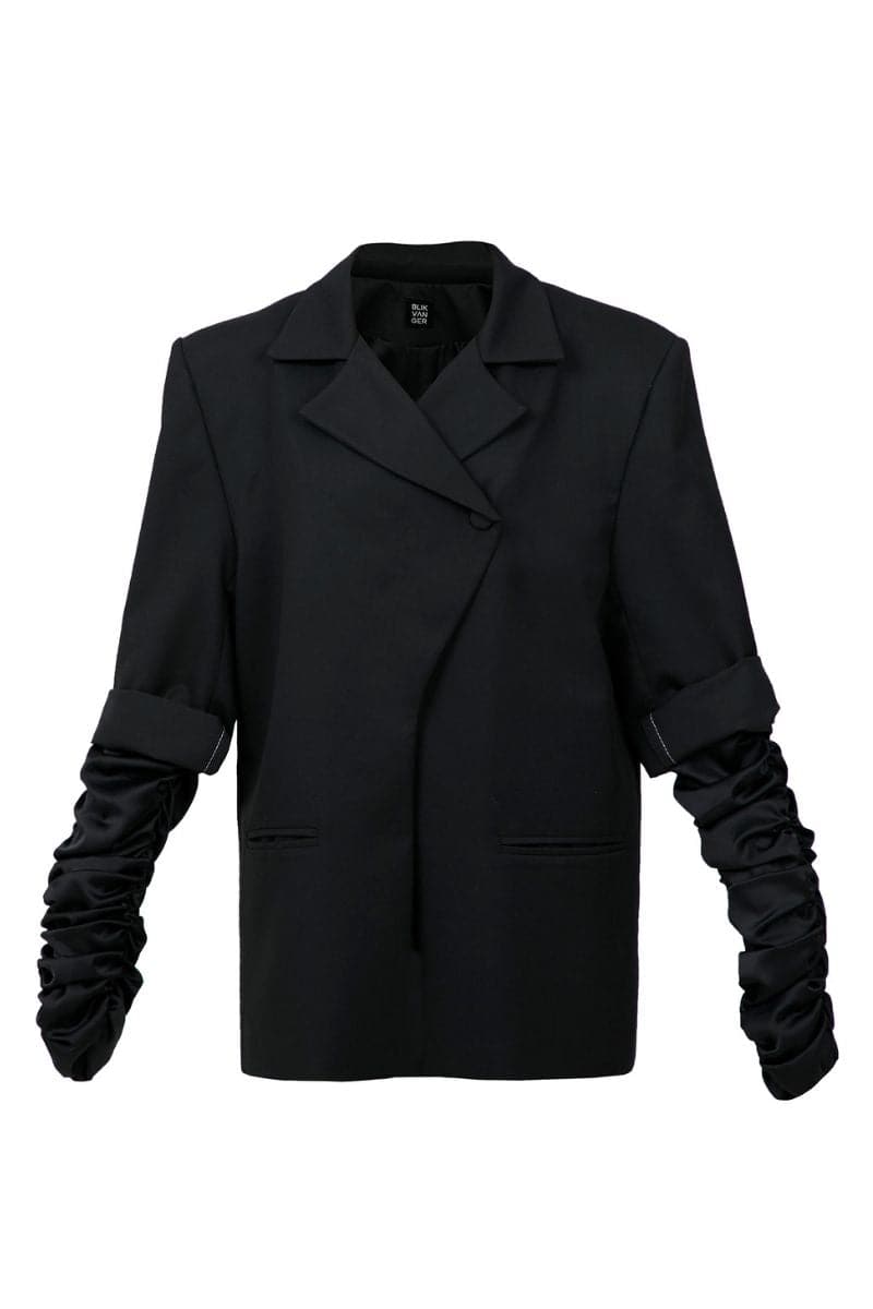 crumple-sleeve long black blazer