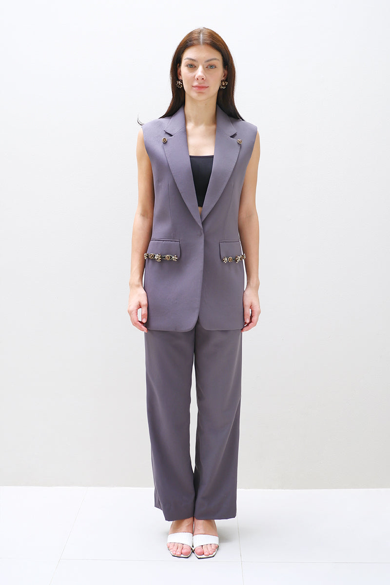Structured vest crafted in an grey-inspired fabric. Adorned with beaded details and gold-colored crystal dots on both sides and crystals arranged in a firework-like design on pockets, it blends modern sophistication with a timeless touch.