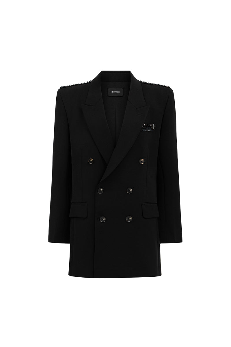 A bold, structured silhouette with a touch of glamour from its crystal-adorned pocket. Its relaxed fit and sharp tailoring make it a versatile statement piece for any occasion.
