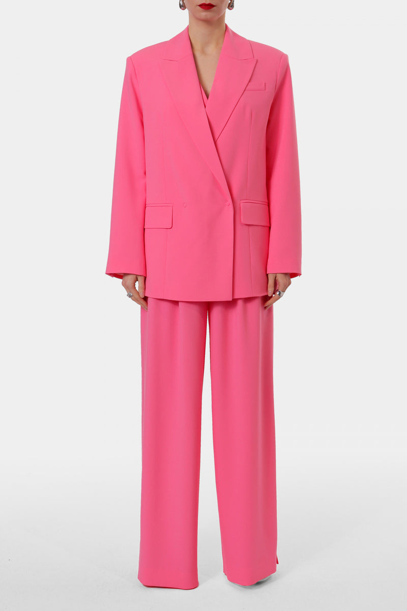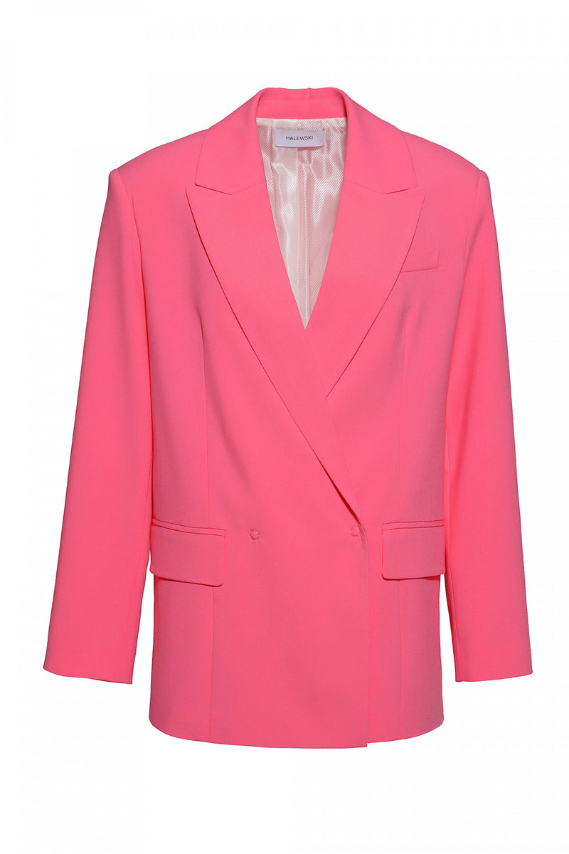 This long, voluminous blazer is in vibrant pink. Wide lapels, double-breasted fastening, and a strongly defined shoulder line protruding beyond the silhouette line create a strong look. Wear it with the Omena Barbie Pink Pants and Sylvia Barbie Pink Vest.