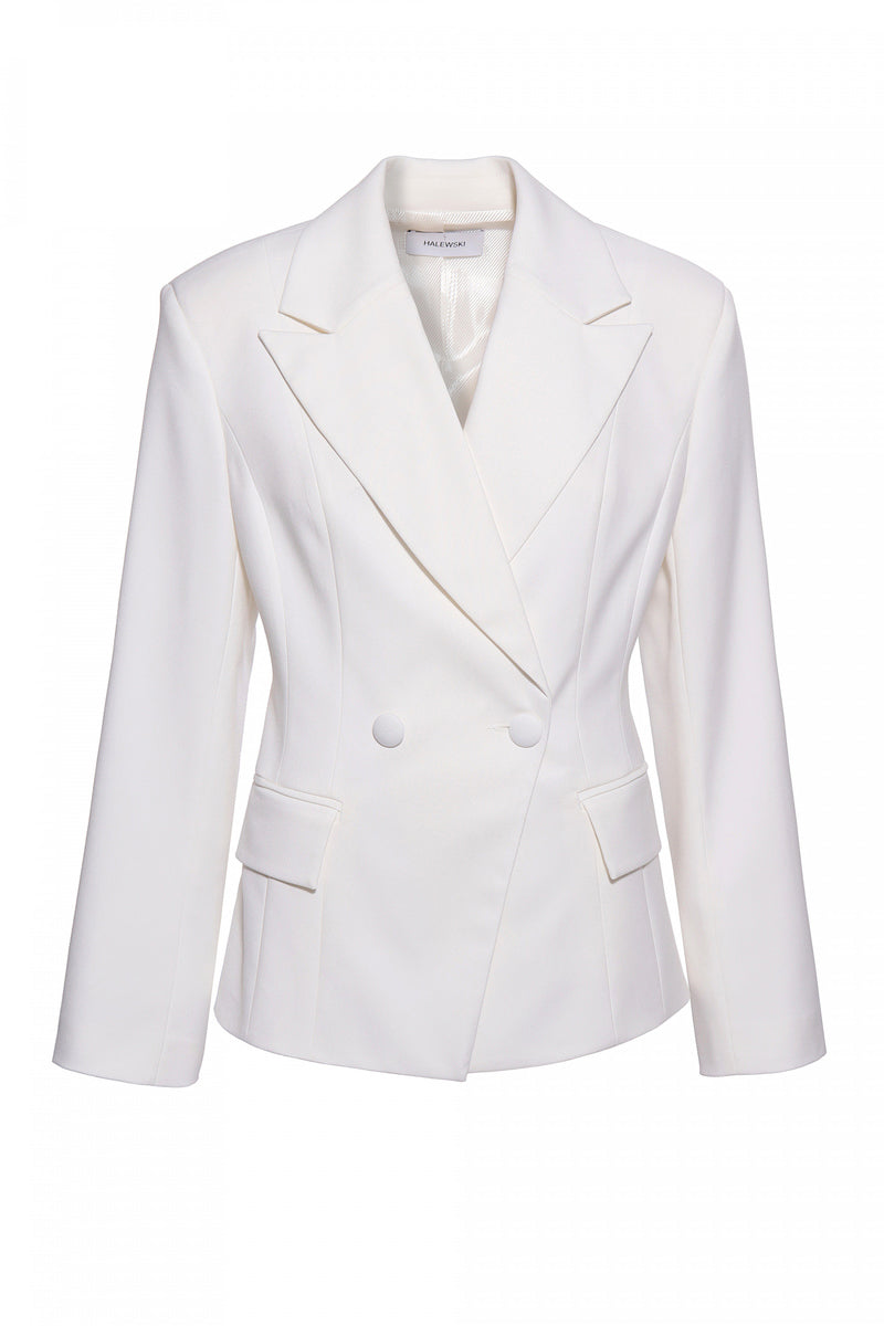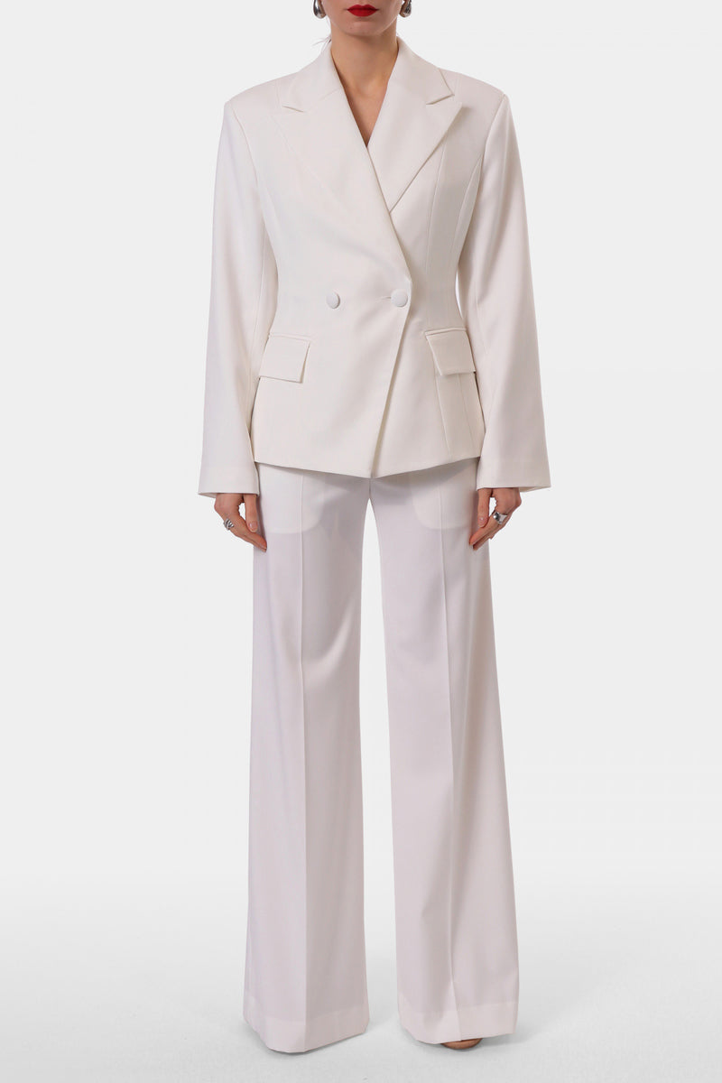 A fitted X-shaped blazer in white. Double-breasted fastening with a pair of textile-coated buttons. Underlined waist, wide lapels and spacious sleeves add an edgy touch to the design. Wear it with Franzi Off White wide trousers and Sylvia Off White vest.