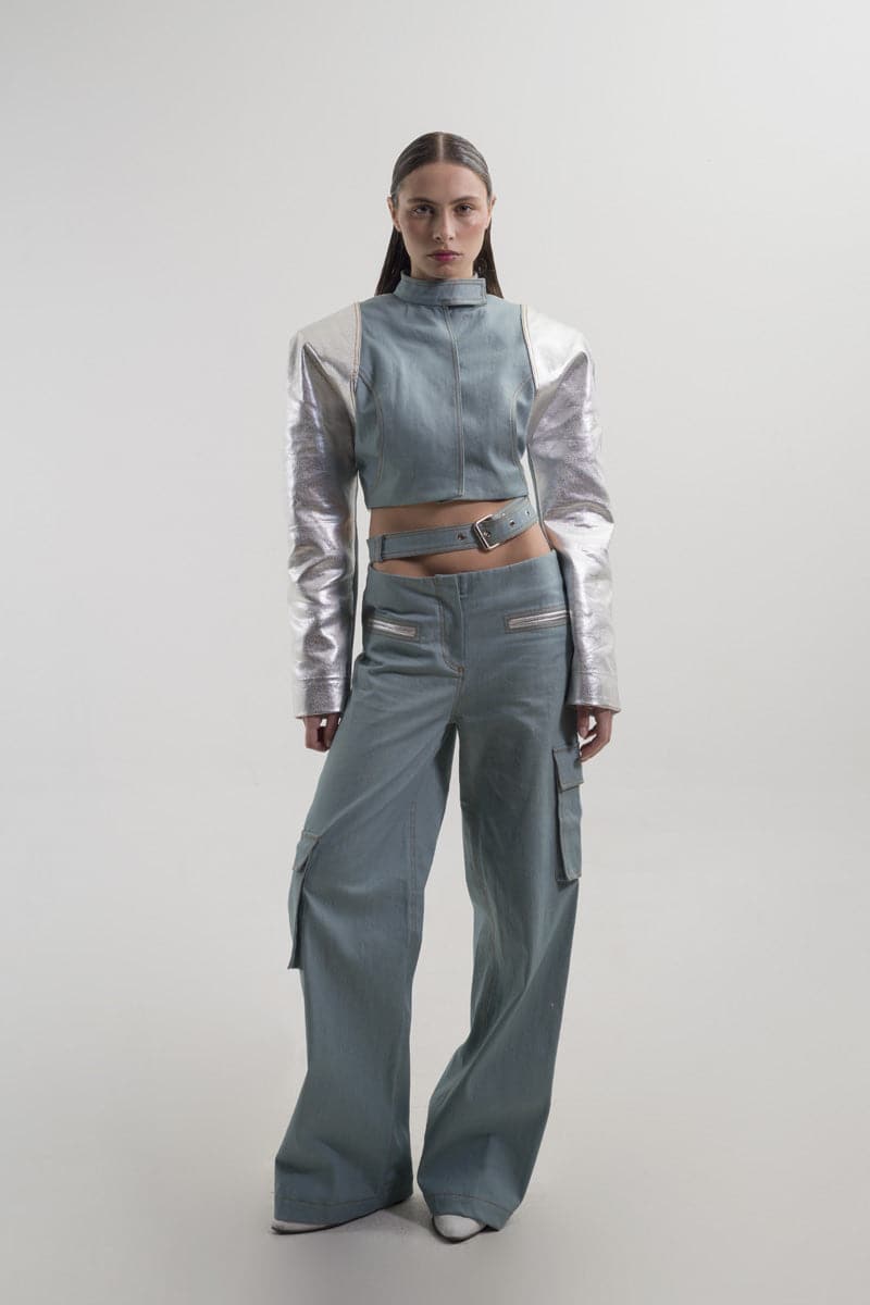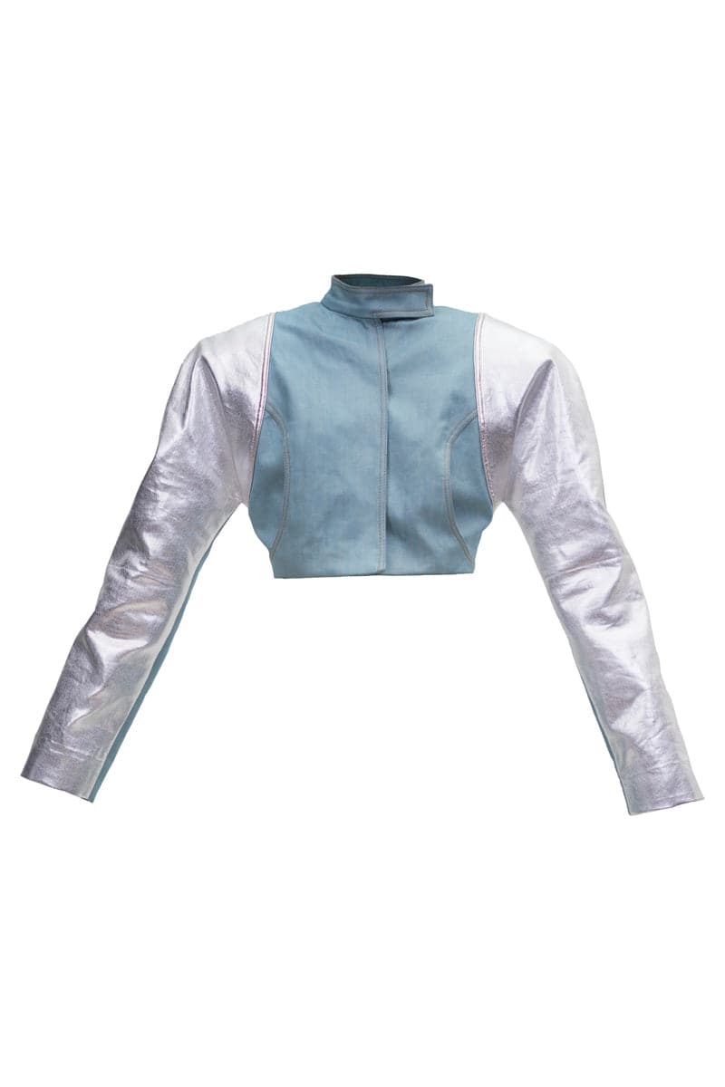 silver and denim cropped high-neck blazer