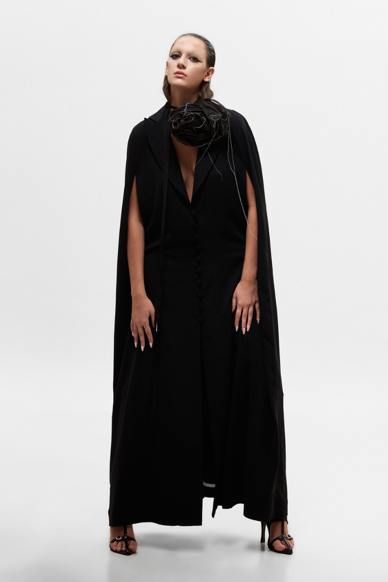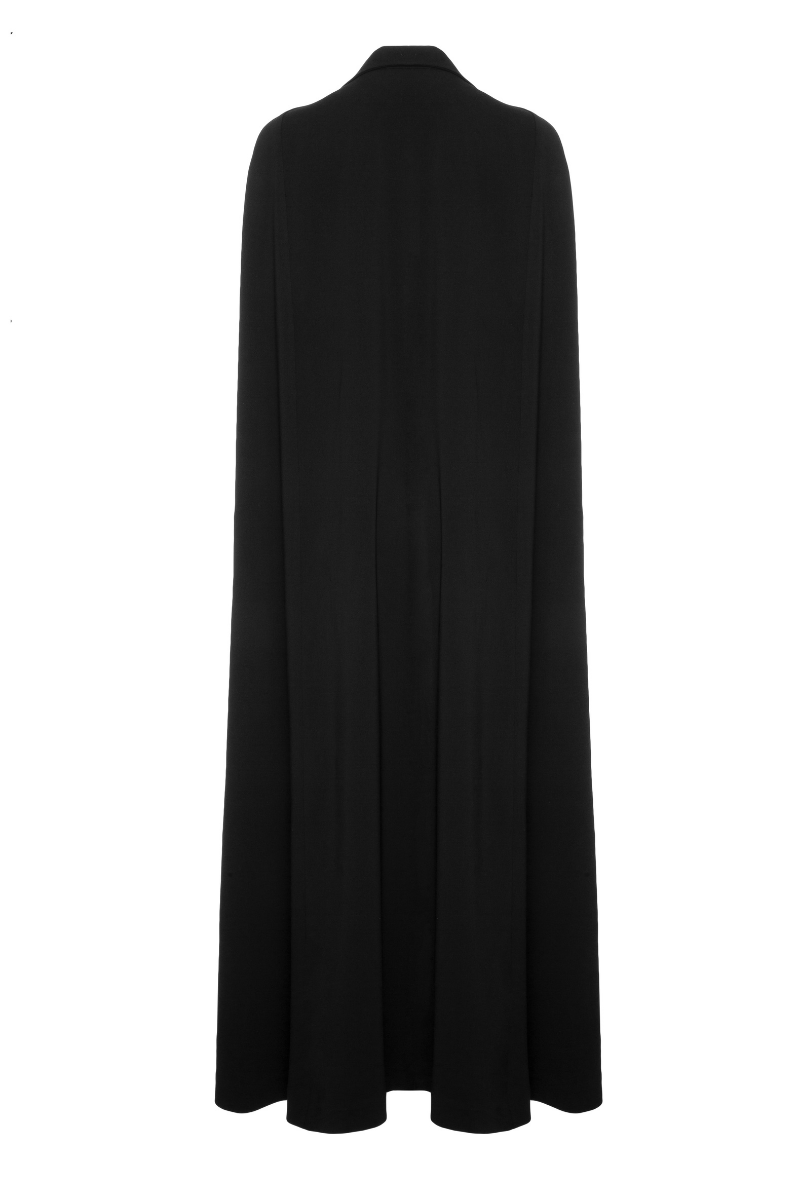 Luxuriously crafted from the finest materials, this single button long cape exudes sophistication and timeless elegance. Exceptionally tailored with a sleek lapel, it is a must-have for any wardrobe that seeks to keep its classic style.