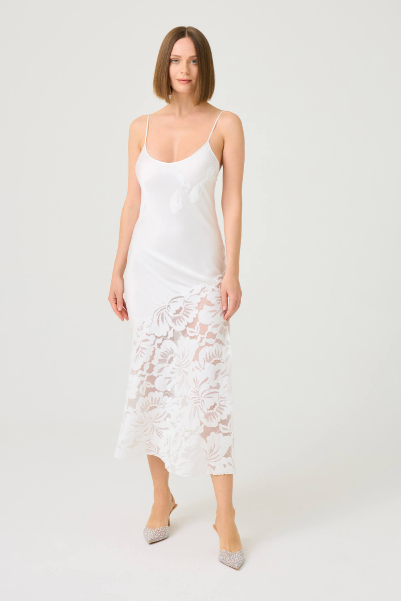 - Design: Long Bias-Cut Slip Dress with Lace on Chest and Adjustable Spaghetti Straps