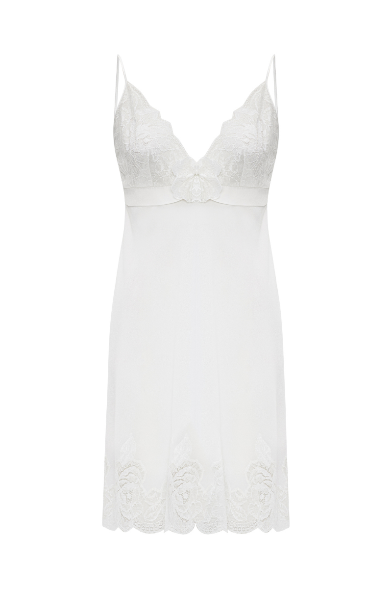 The Miss Alba Nightgown is a delicate expression of modern femininity. Cut from soft silk crepe, this short nightgown features a V-neckline with fine lace detail at the chest and adjustable spaghetti straps for comfort. A timeless piece for graceful lounging.
