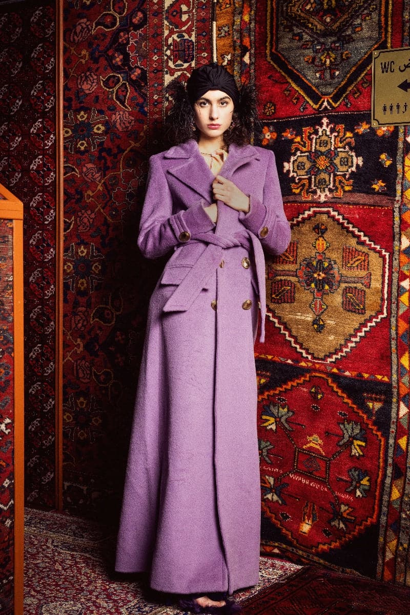 Nana Gotti’s double-breasted coat is striking, with its padded power shoulders and maxi length. It’s tailored from soft, short hair faux fur with exaggerated peak lapels and a belt to knot around the waist, creating an oversized fit.