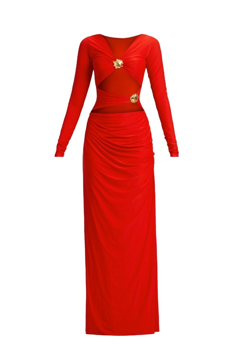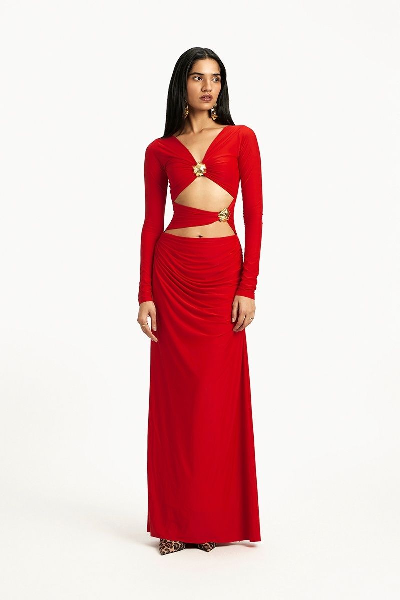 Full-sleeve red gown with cut-out details on the top, asymmetrical ruching at the hips, and a gold brooch