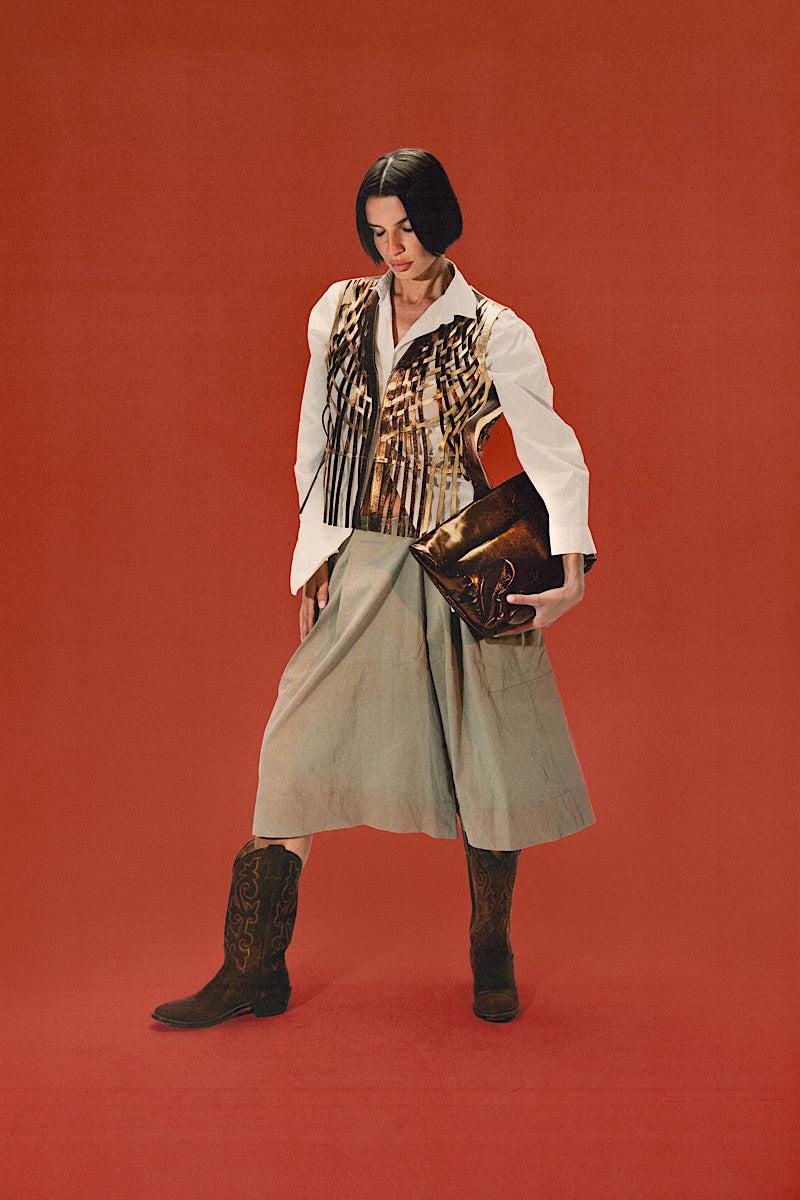 The Attalea leather vest II is one of Double A’s signature designs, it is a straight fit woven fringed vest with a v-neckline and a double metal hook fastening at the front. Featuring a brilliant color combo. It can be dressed up or down, casually or formally, in winter or summer. It is truly the piece that you will rely on to popup your outfit.