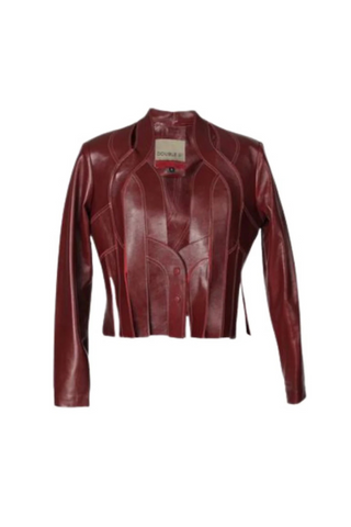 - Leather Jacket featuring interlaced leather straps with bold white stitching
