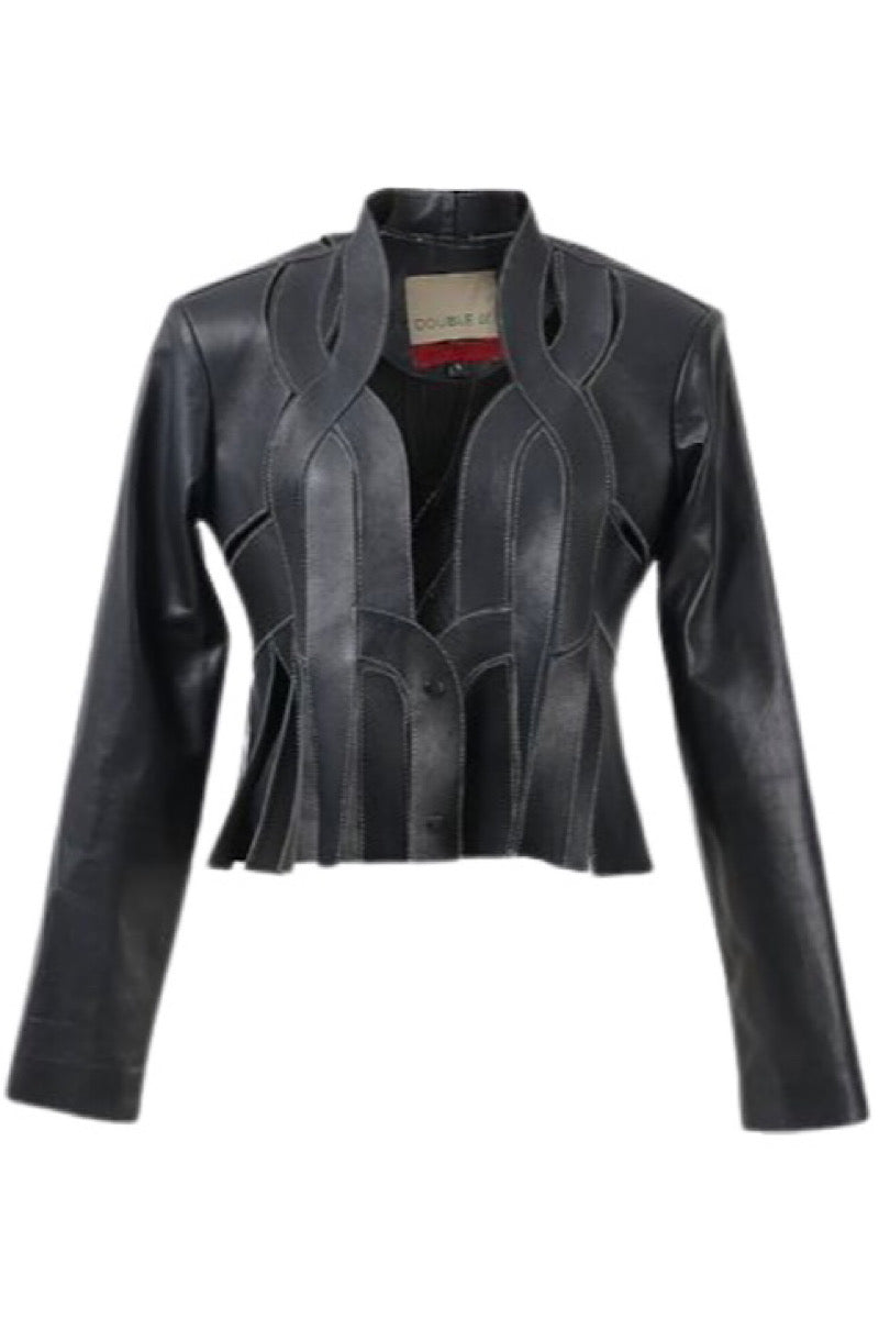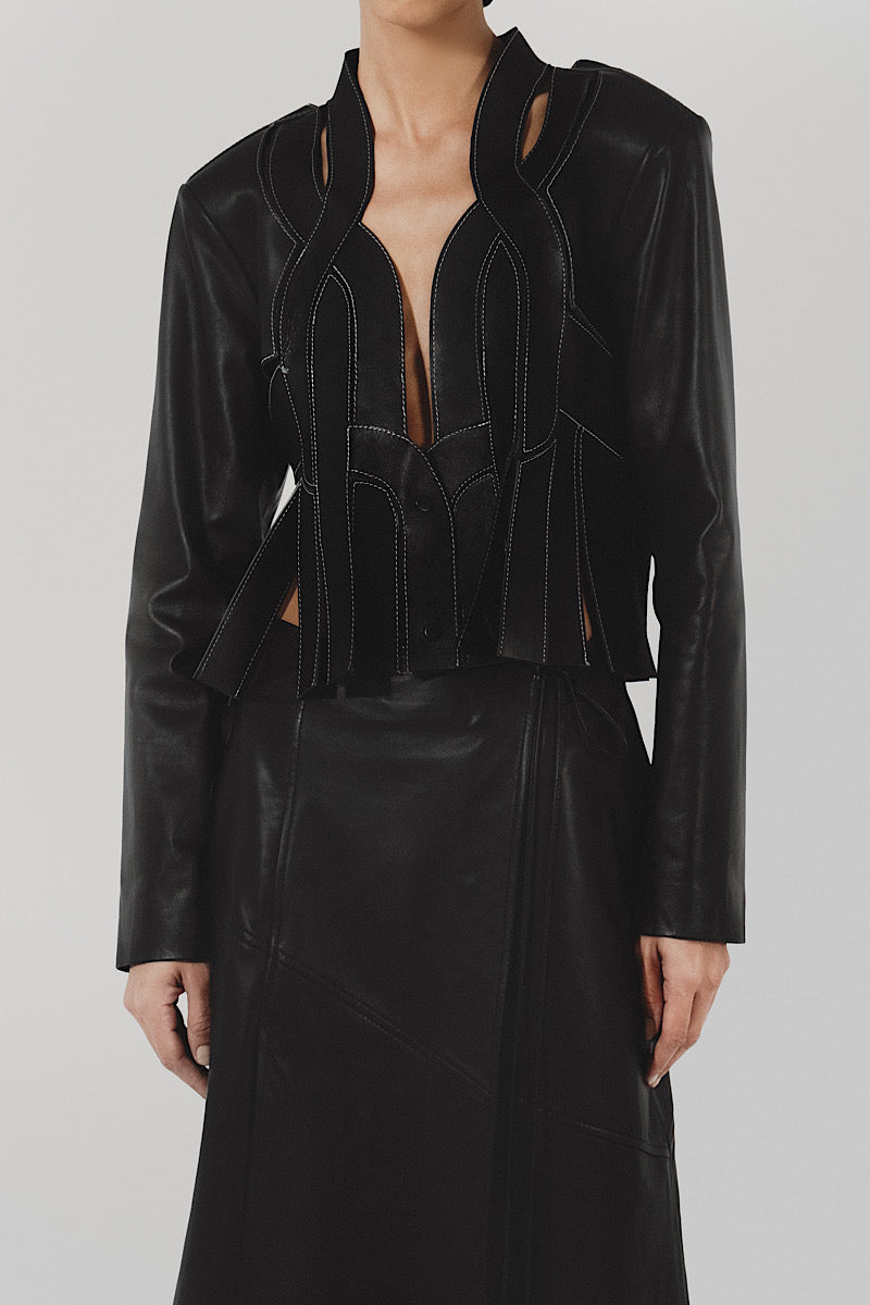 - Leather Jacket featuring interlaced leather straps with bold white stitching