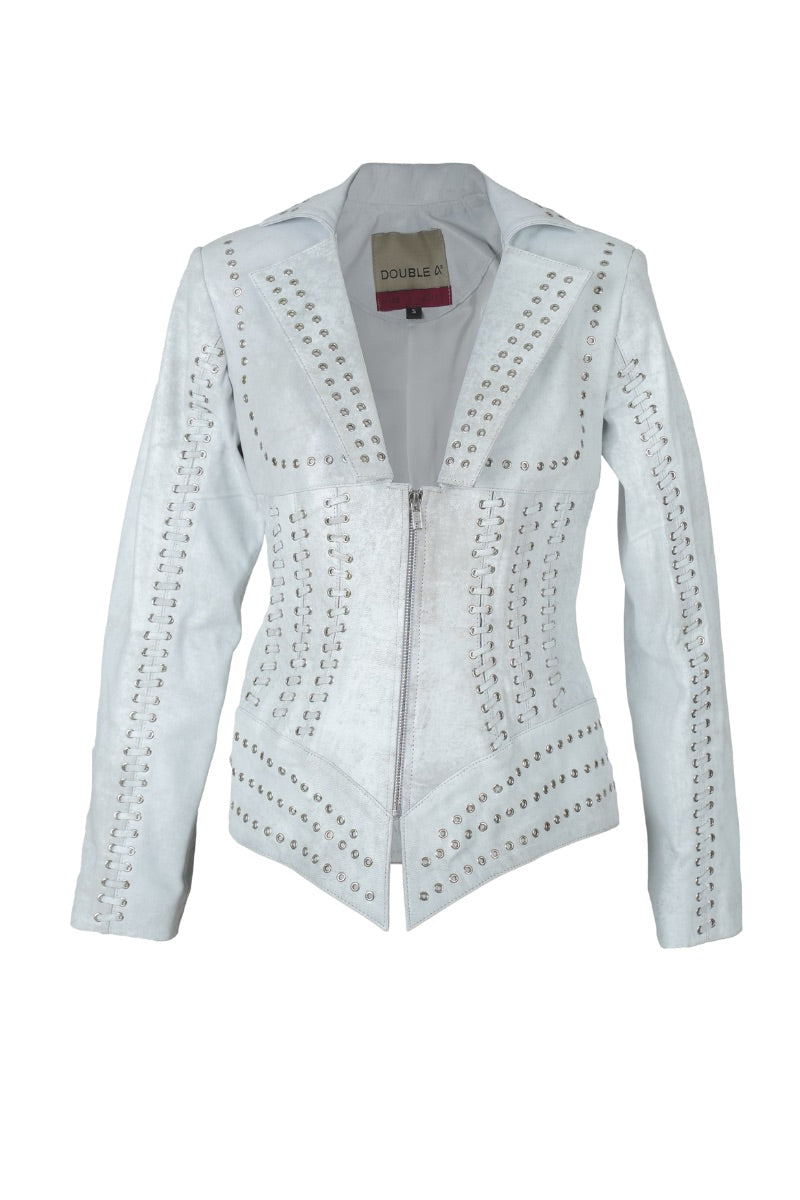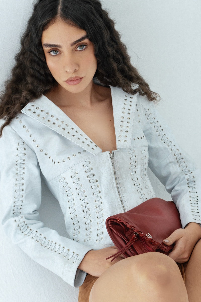 The Kayla is a striking leather jacket that merges structure with bold detailing. Designed with interlaced leather stripes featuring eyelets and threaded leather ropes, this piece creates a defined corset-like silhouette that enhances the body’s shape. The lapel collar adds a refined touch, while the front metal zipper closure provides a sleek finish. A statement piece on its own, this jacket is the perfect blend of edgy craftsmanship and timeless sophistication.