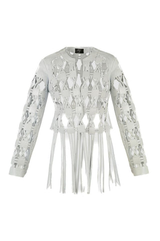 The heather jacket is the perfect piece of art that will definitely do all the talk with its uniqueness and leather cuts. It features geometrical cuts that are connected with leather straps, includes metal hooks and fringes at the hem.