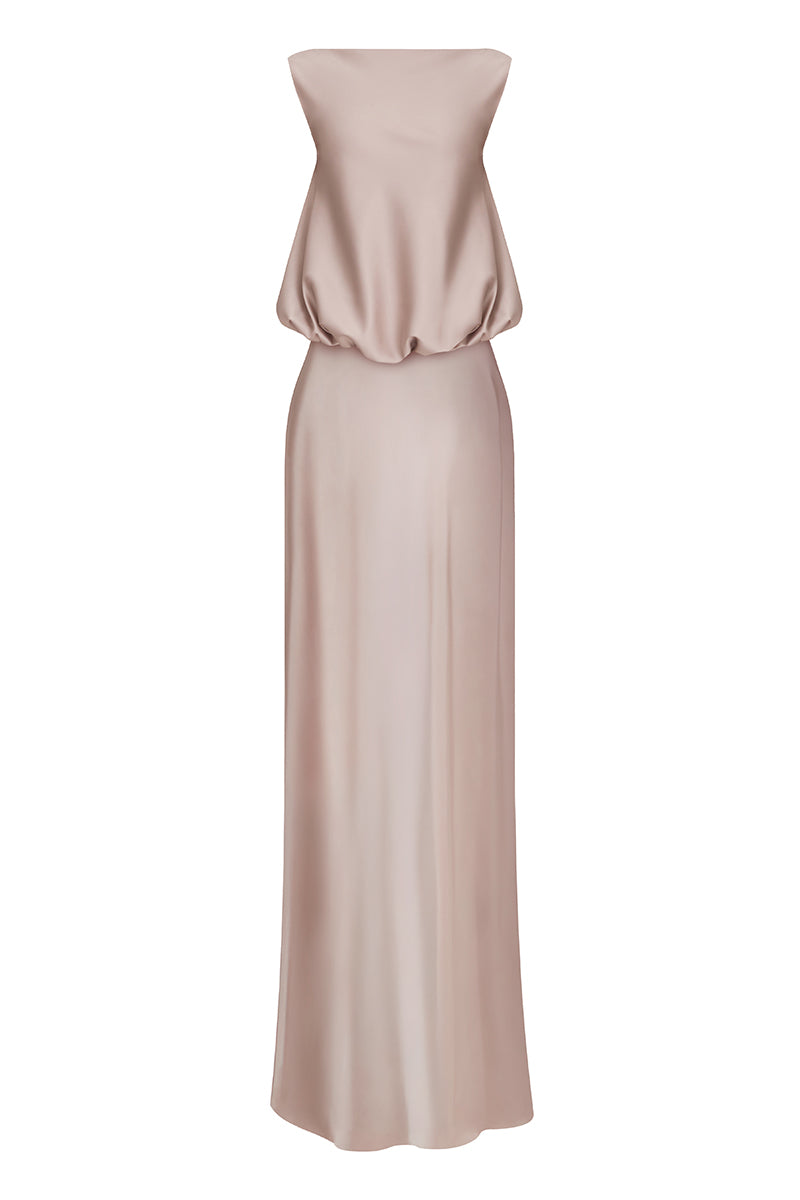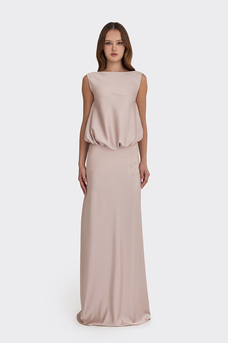 puffed boatneck maxi gown in silver pink