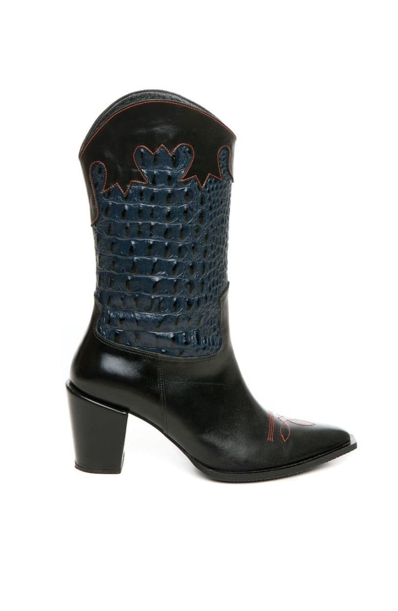 These Western style heeled boots are made in the purest leather. They feature a croc-embossed leather for a unique look.