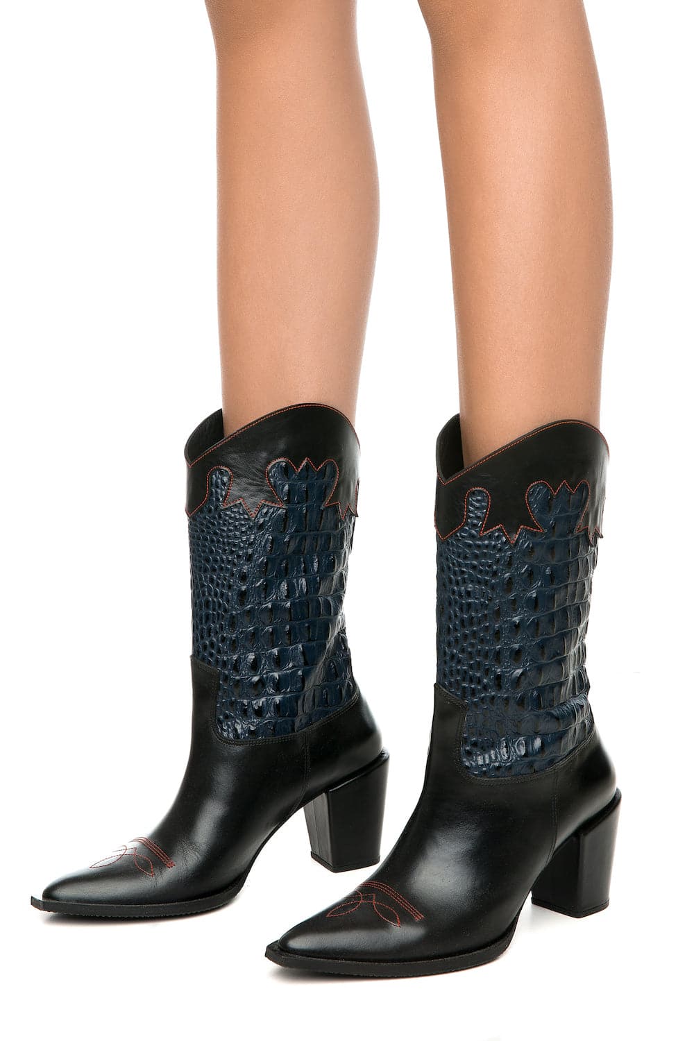 croc-embossed mid-calf cowboy leather boots
